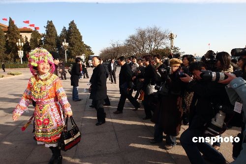 3月9日,十一屆全國人大二次會議在人民大會堂舉行第二次全體會議,穿著亮麗民族服飾的女代表成為攝影記者追逐的對象。中新社發(fā) 杜洋 攝