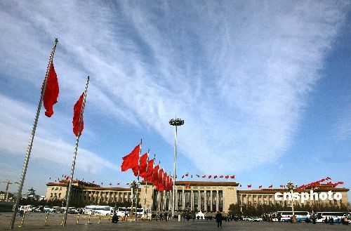 3月9日上午,北京人民大會堂上空襯托著藍天祥云。當(dāng)日,十一屆全國人大二次會議第二次全體會議在北京人民大會堂舉行。中新社發(fā) 任晨鳴 攝