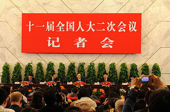 3月10日,十一屆全國(guó)人大二次會(huì)議舉行記者會(huì),工業(yè)和信息化部部長(zhǎng)李毅中、人力資源和社會(huì)保障部部長(zhǎng)尹蔚民、商務(wù)部部長(zhǎng)陳德銘答記者問(wèn)。陳樹(shù)根 攝