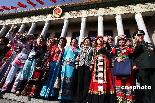3月13日,第十一屆全國人民代表大會第二次會議在人民大會堂閉幕,代表們在人民大會堂前留影。中新社發(fā) 杜洋 攝
