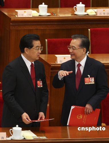 圖:胡錦濤、溫家寶在人大閉幕會上交談