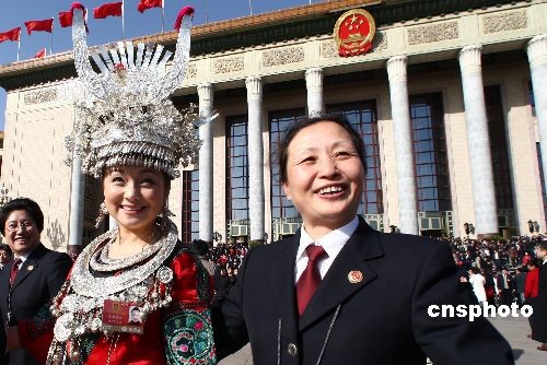 3月13日,第十一屆全國人民代表大會第二次會議在人民大會堂舉行閉幕會,一名參加旁聽的女檢察官和貴州苗族女代表雷阿幼朵會后一起合影留念。中新社發(fā) 杜洋 攝
