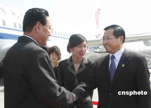 應(yīng)國(guó)務(wù)院總理溫家寶的邀請(qǐng)對(duì)中國(guó)進(jìn)行正式友好訪問(wèn)的朝鮮內(nèi)閣總理金英日,三月十七日中午由北京乘機(jī)抵達(dá)濟(jì)南。圖為山東省副省長(zhǎng)才利民(右)在濟(jì)南國(guó)際機(jī)場(chǎng)迎接金英日總理。中新社發(fā) 張璐 攝