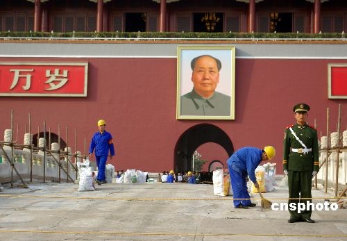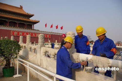 3月19日,施工人員在北京天安門金水橋上施工修理。據(jù)悉,預(yù)計(jì)天安門金水橋全面修繕工作將于5月1日前完成,并整體向游客開(kāi)放。中新社發(fā) 九州 攝