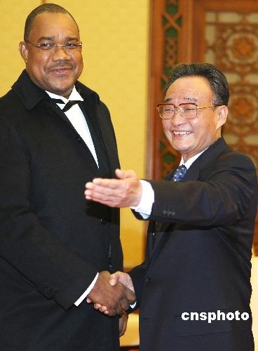 3月23日下午,中國(guó)全國(guó)人大常委會(huì)委員長(zhǎng)吳邦國(guó)在北京人民大會(huì)堂會(huì)見來(lái)訪的塞舌爾國(guó)民議會(huì)議長(zhǎng)帕特里克·赫米尼耶一行。中新社發(fā) 任晨鳴 攝