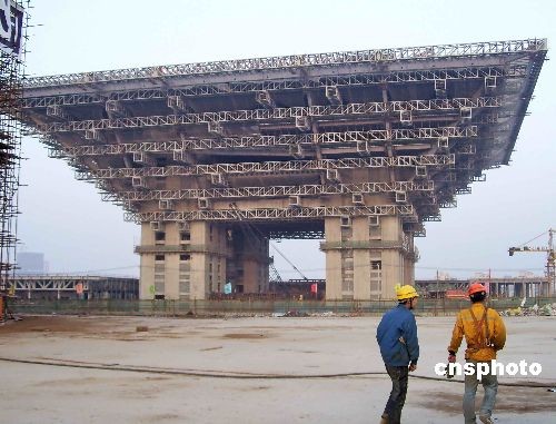 2009年3月25日消息,上海世博會場館建設正在有條不紊地進行。上海世博會執(zhí)委會副主任周漢民透露,中國館目前已經封頂,今年年底建設將全部完成。中國館是上海世博會的標志性建筑,將永久地保存。中新社發(fā) 井韋 攝