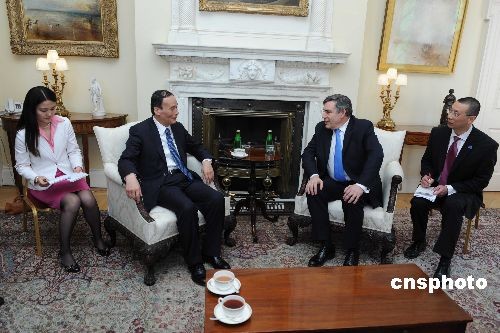 當(dāng)?shù)貢r(shí)間5月11日,英國(guó)首相布朗在倫敦唐寧街10號(hào)首相府會(huì)見(jiàn)中國(guó)國(guó)務(wù)院副總理王岐山。王岐山于5月8日至12日期間對(duì)英國(guó)進(jìn)行訪(fǎng)問(wèn),并與英國(guó)財(cái)政大臣達(dá)林共同主持了第二次中英經(jīng)濟(jì)財(cái)金對(duì)話(huà)。中新社發(fā) 魏群 攝