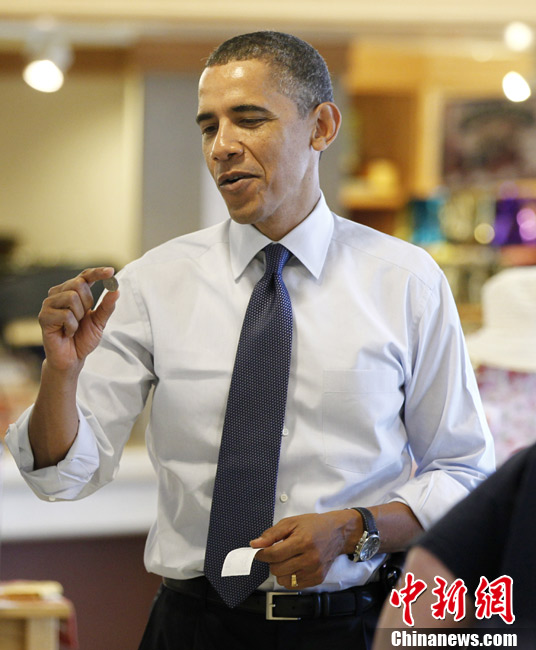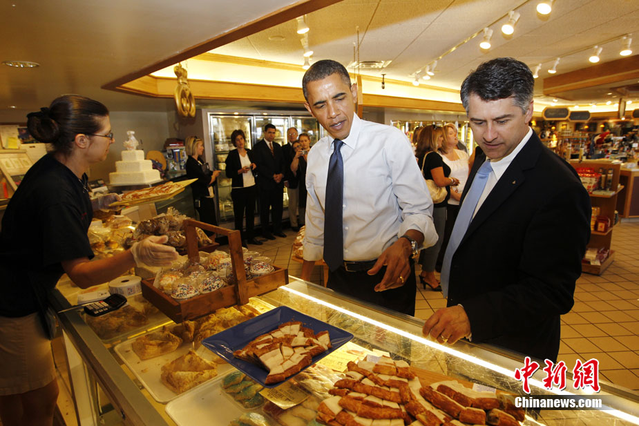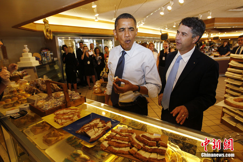 6月30日,美總統(tǒng)奧巴馬和威斯康星州拉辛市市長(zhǎng)在前往出席市政廳會(huì)議的路上拐進(jìn)一家面包店,品嘗甜點(diǎn)。