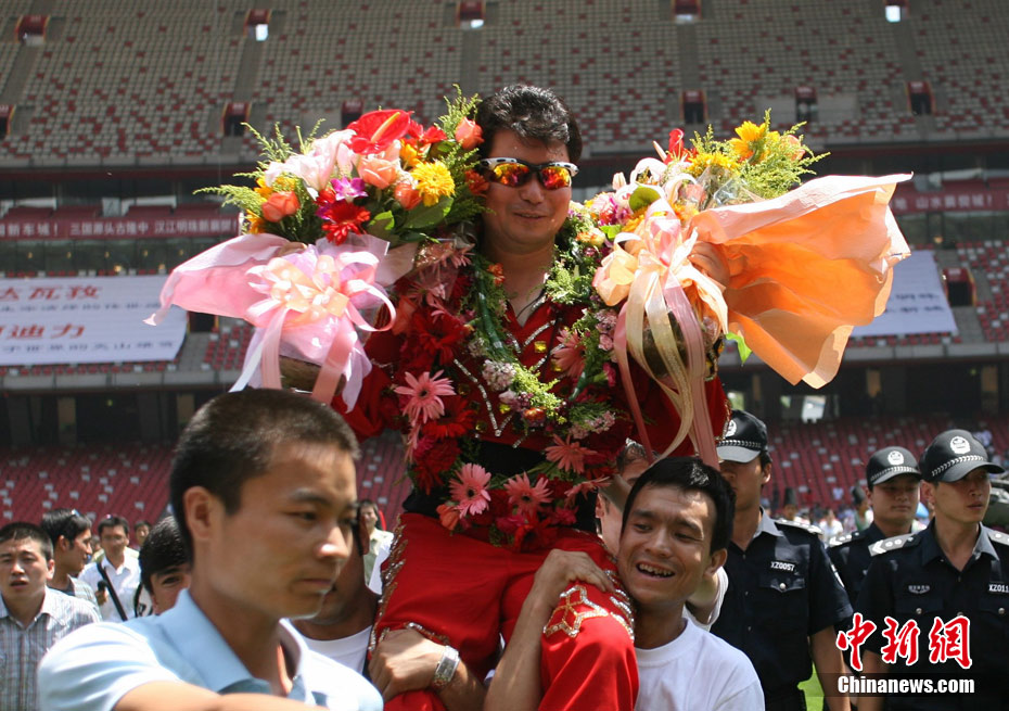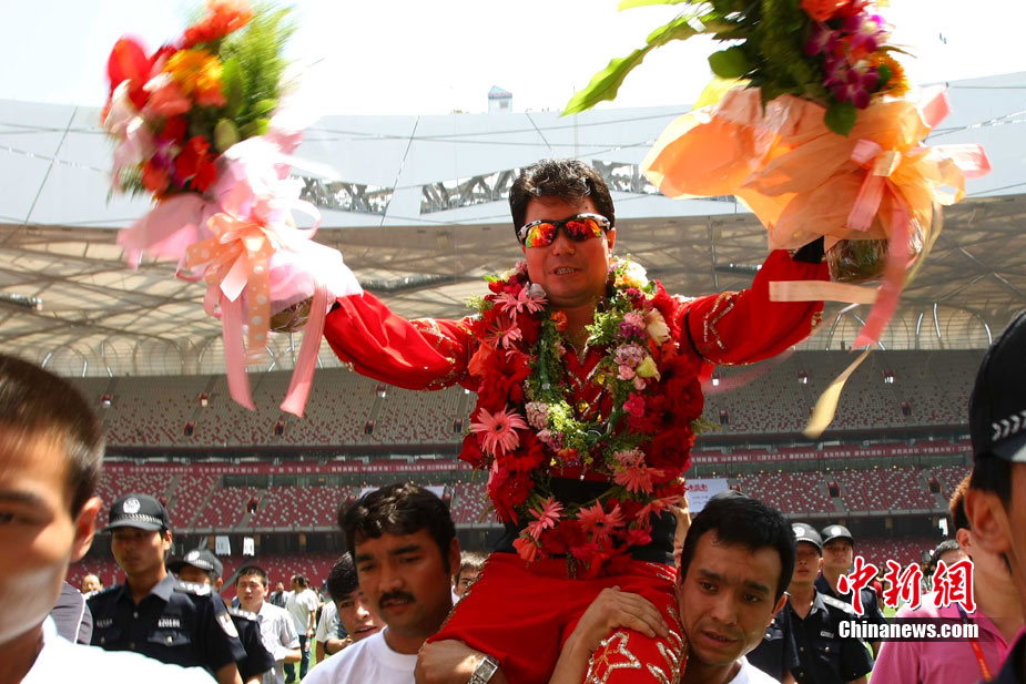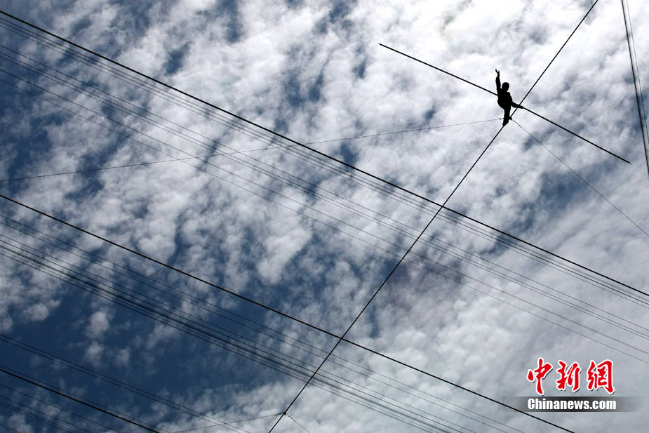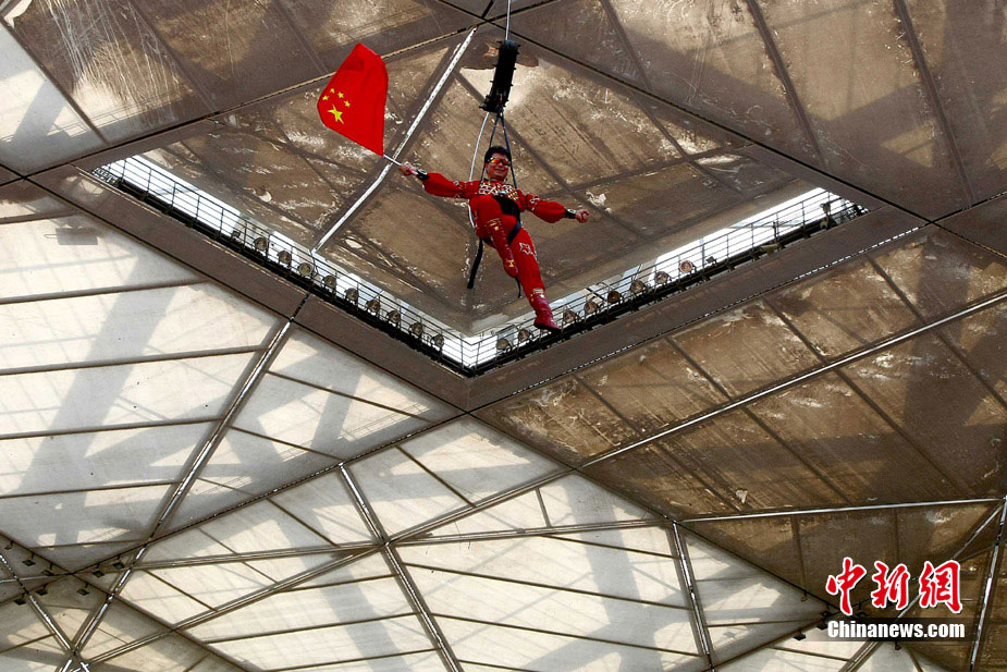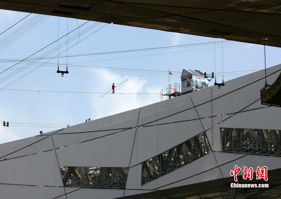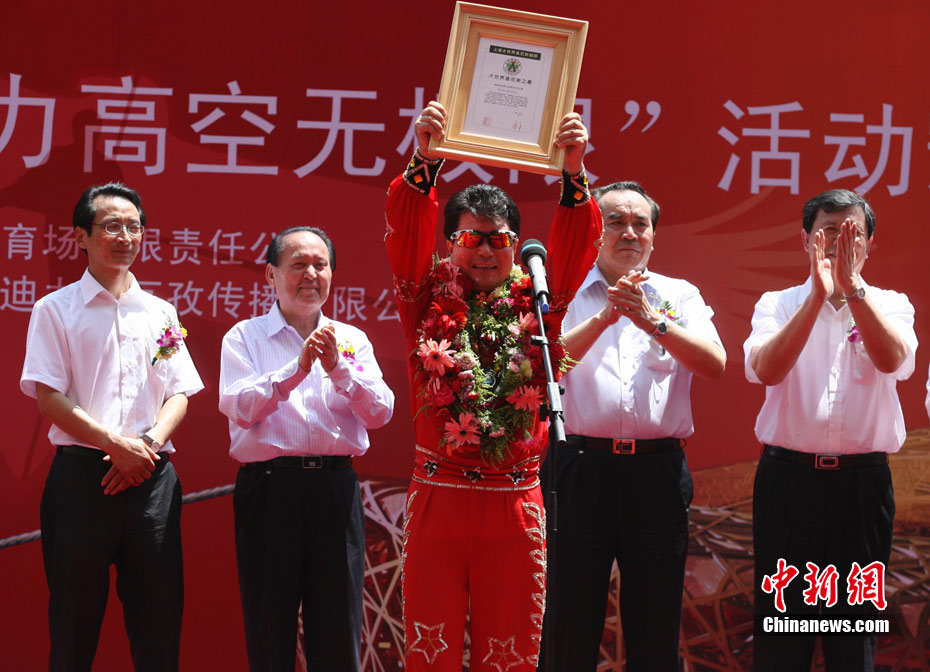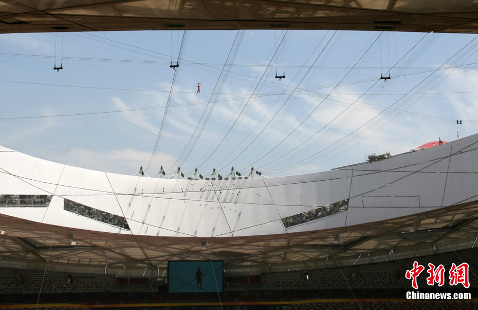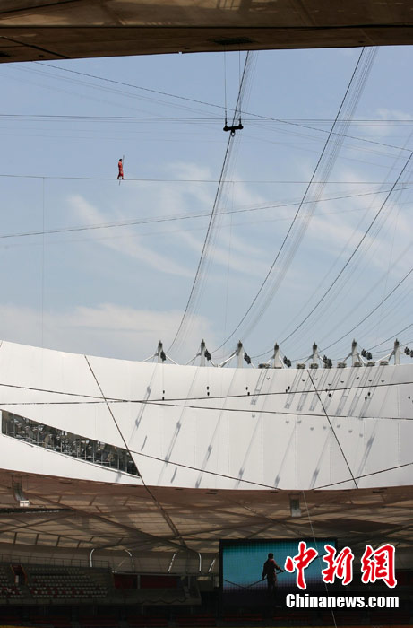 7月2日,在鳥巢上空艱難生活60天之后,高空王子阿迪力告別鳥巢回到地面,同時(shí)創(chuàng)造了60天累計(jì)連續(xù)走綱絲時(shí)間最長吉尼斯世界紀(jì)錄。圖為阿迪力用吊威亞的方式回到地面。中新社發(fā) 富田 攝
