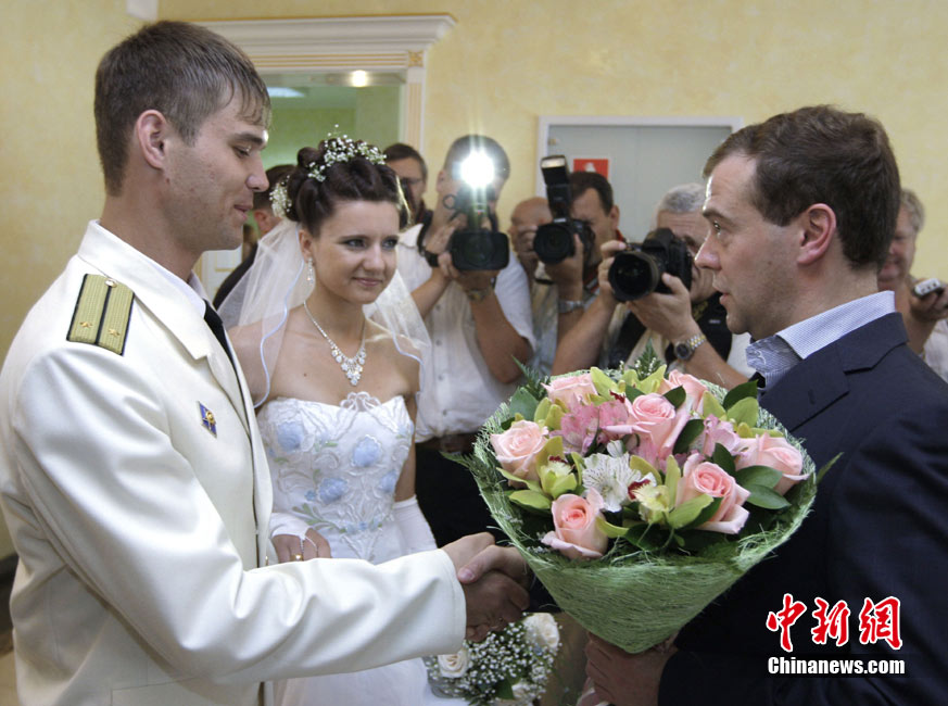 7月1日,俄總統(tǒng)梅德韋杰夫在遠(yuǎn)東視察時(shí),參觀了當(dāng)?shù)匾惶幓橐龅怯浱,成為三?duì)新人的婚禮見(jiàn)證人,并給他們送上了非常貴重的禮物。