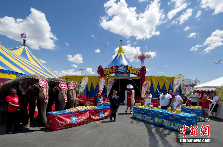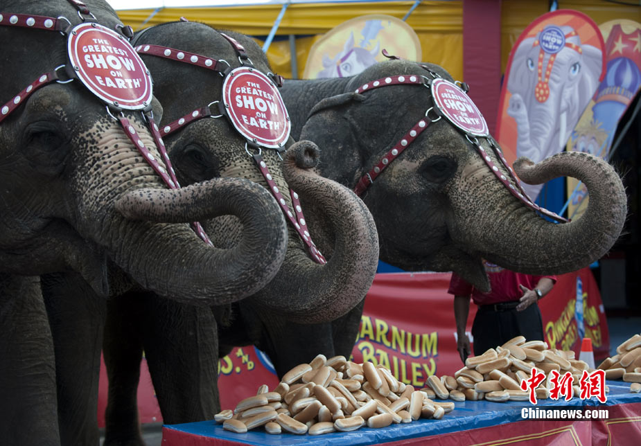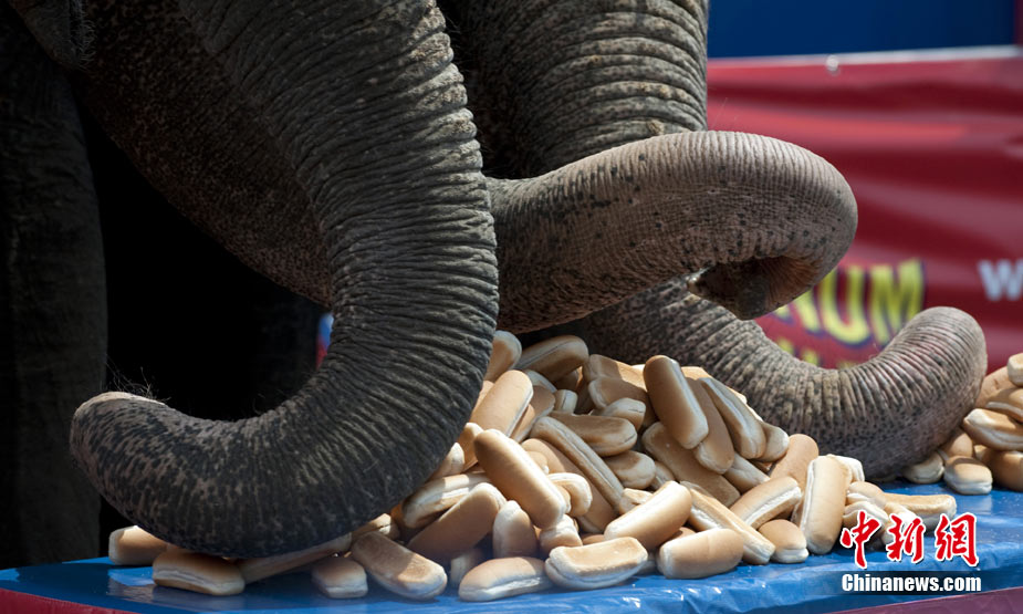 當(dāng)?shù)貢r間7月2日,在美國紐約的科尼島,一支由三只大象組成的“隊伍”和三位大胃王進行了一次吃面包PK。最終大象隊獲得了勝利。