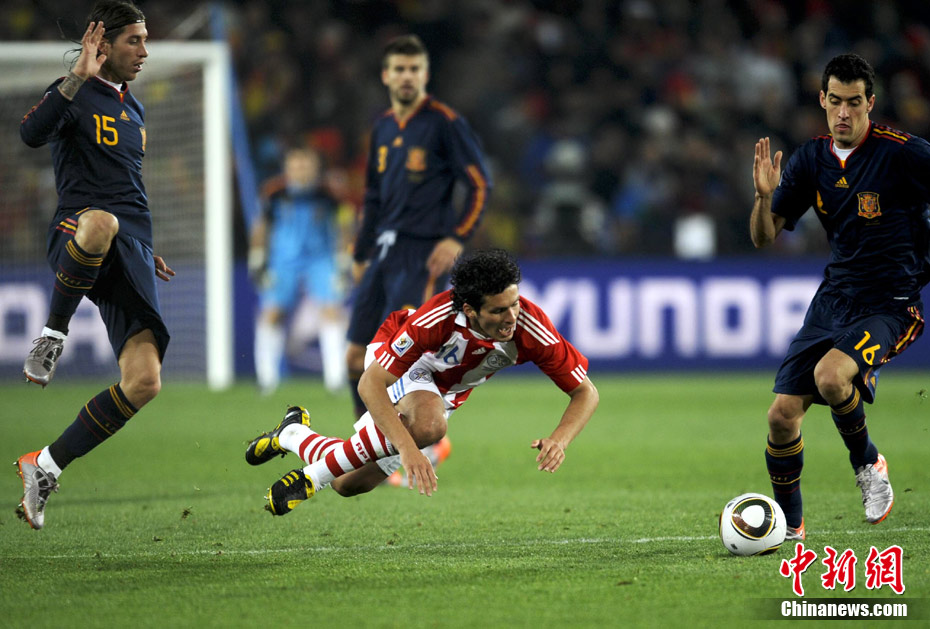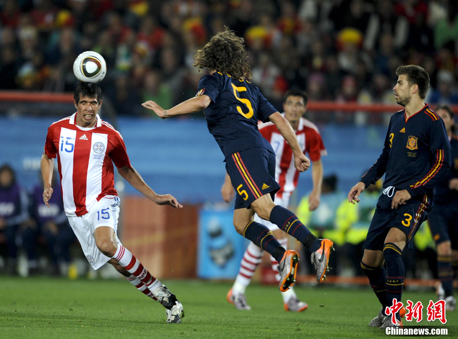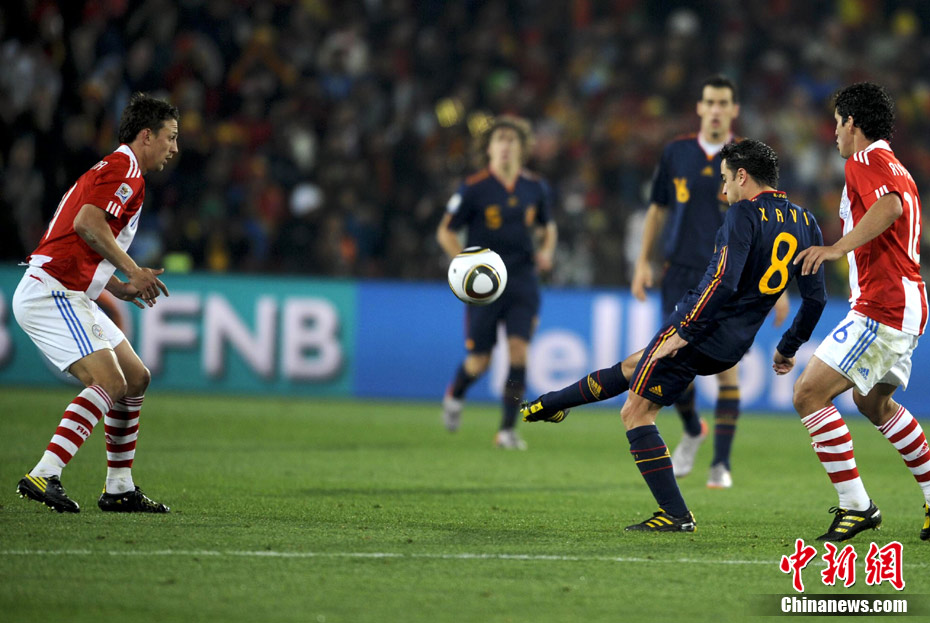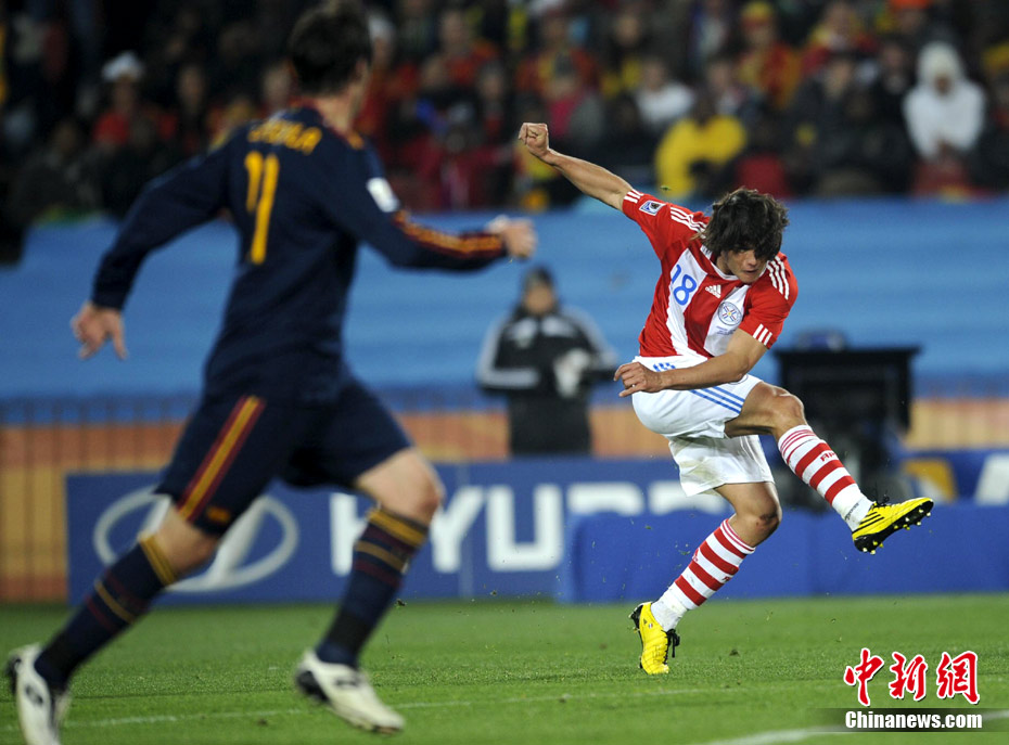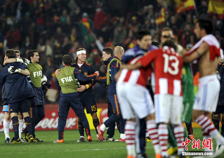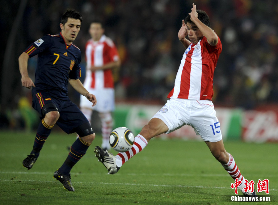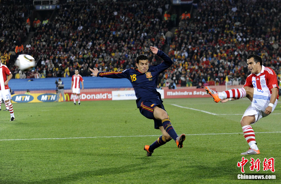 7月4日凌晨,南非世界杯最后一場1/4決賽打響,西班牙在約翰內(nèi)斯堡的愛麗絲公園球場迎來了南美勁旅巴拉圭隊。憑借比利亞在第83分鐘的進球,西班牙1-0擊敗巴拉圭,晉級四強。中新社記者 廖攀 攝