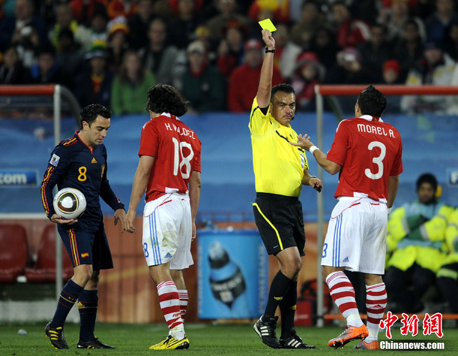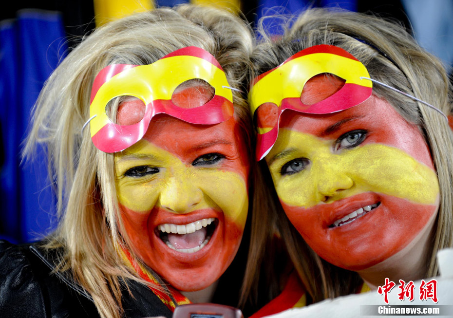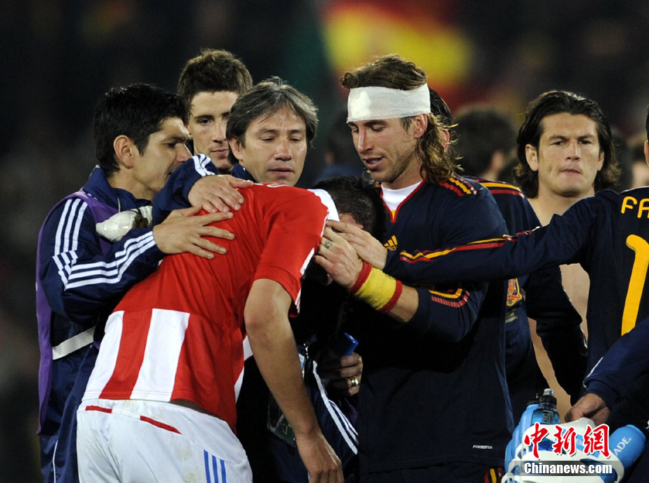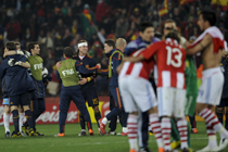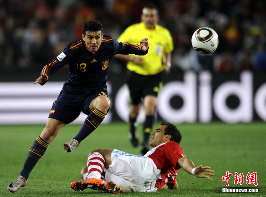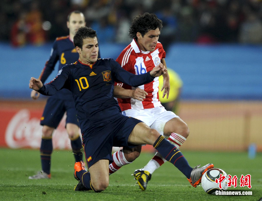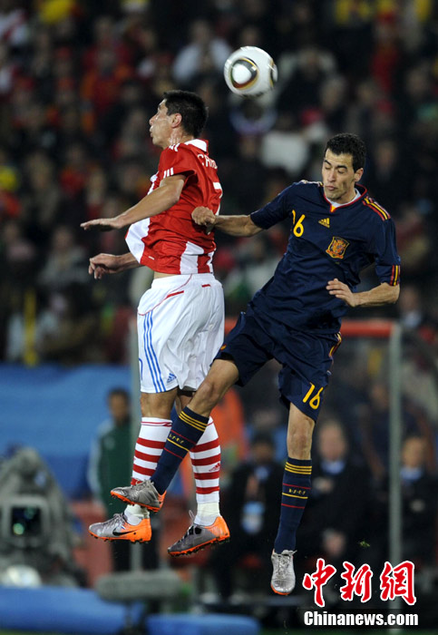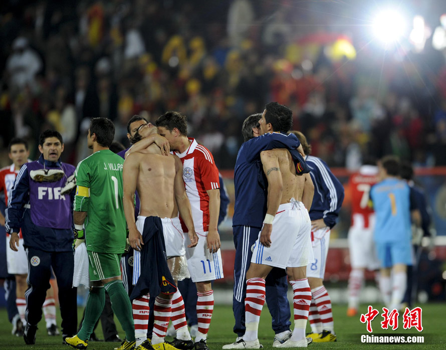 7月4日凌晨,南非世界杯最后一場1/4決賽打響,西班牙在約翰內(nèi)斯堡的愛麗絲公園球場迎來了南美勁旅巴拉圭隊。憑借比利亞在第83分鐘的進球,西班牙1-0擊敗巴拉圭,晉級四強。中新社記者 廖攀 攝