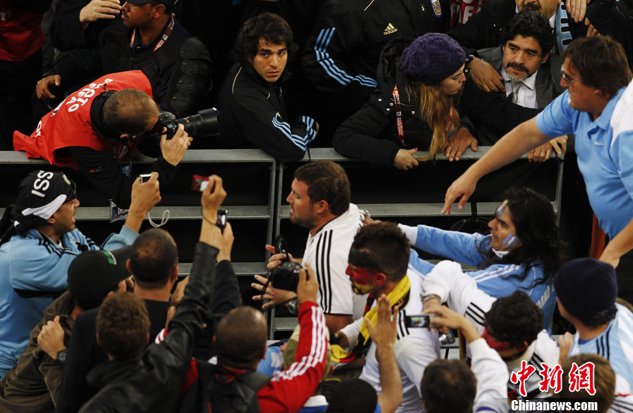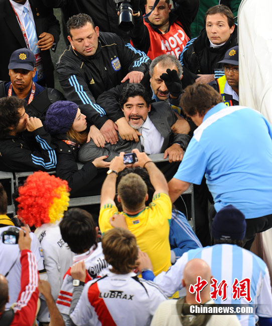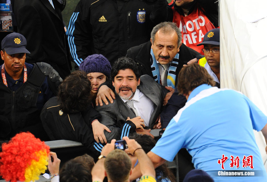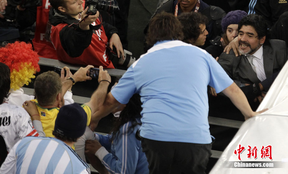 南非世界杯阿根廷與德國(guó)隊(duì)的比賽結(jié)束后,瘋狂的德國(guó)球迷對(duì)馬拉多納進(jìn)行了辱罵和奚落,急脾氣的老馬轉(zhuǎn)身沖向看臺(tái)與球迷理論,他更是要爬上看臺(tái)親手教訓(xùn)這些球迷。好在大女兒達(dá)爾瑪和阿根廷教練組成員及時(shí)前往制止,否則后果將不堪設(shè)想。