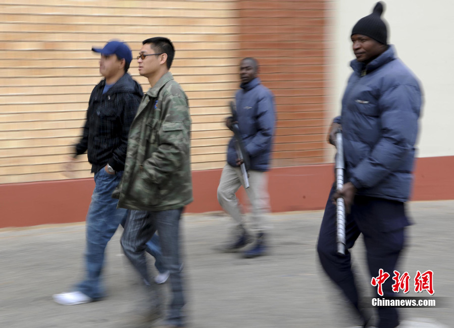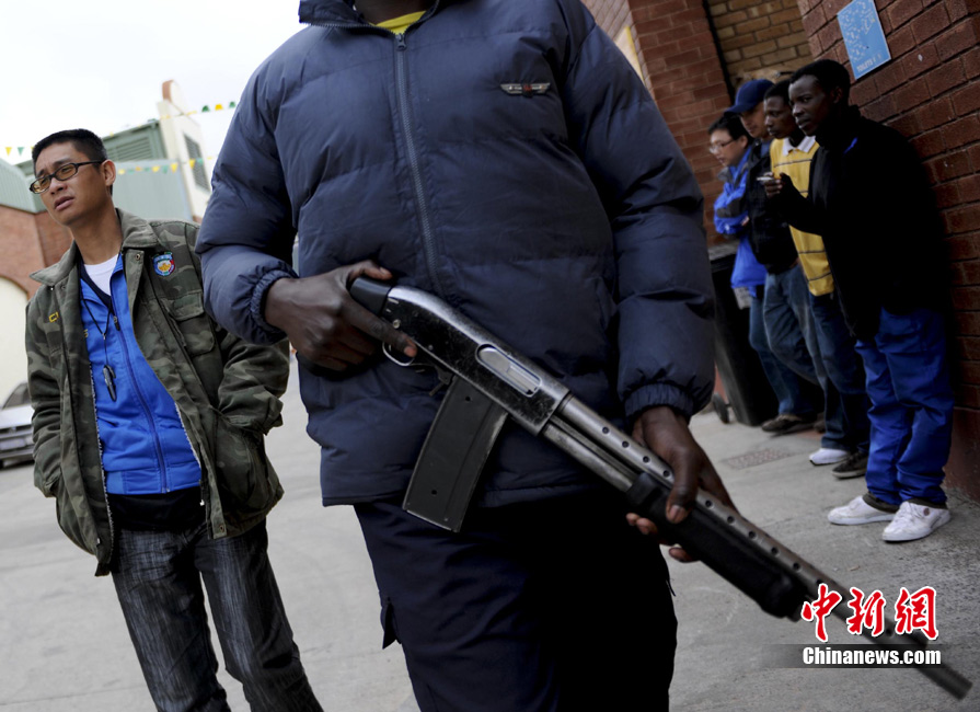 南非華人安保公司總經(jīng)理謝宇航與南非當(dāng)?shù)貑T工持槍在約翰內(nèi)斯堡中國商貿(mào)城內(nèi)巡邏。約翰內(nèi)斯堡被稱為全世界最危險的城市之一。世界杯期間,南非的這種保安公司不僅受雇為球隊做保鏢,而且在警力不足的情況下,許多保安公司受雇于警方,成為保衛(wèi)世界杯安全的一支重要力量。而南非華人安保公司也是其中之一,他們的主要服務(wù)對象是位于約翰內(nèi)斯堡核心城區(qū)的中國商貿(mào)城。中新社發(fā) 廖攀 攝