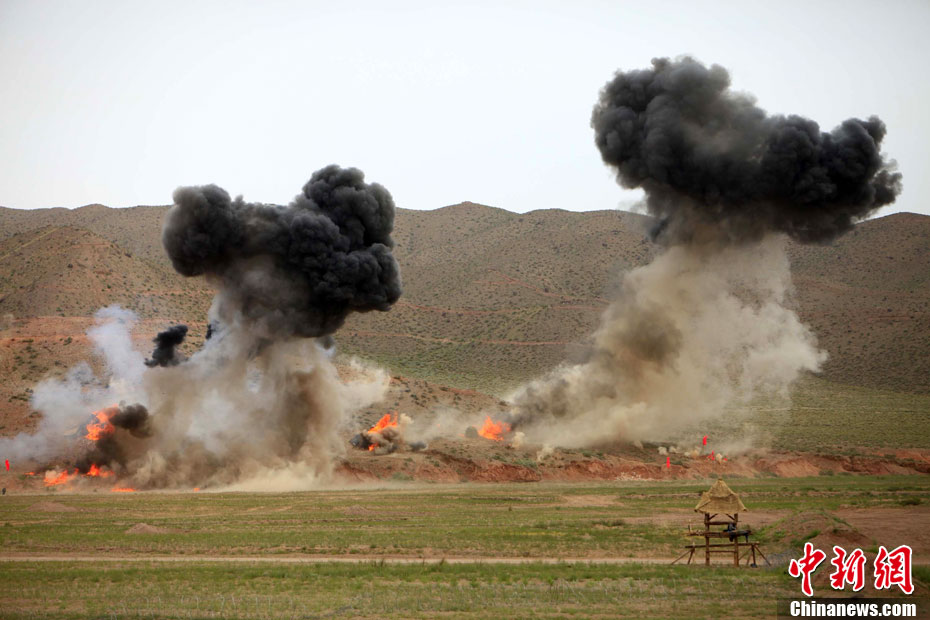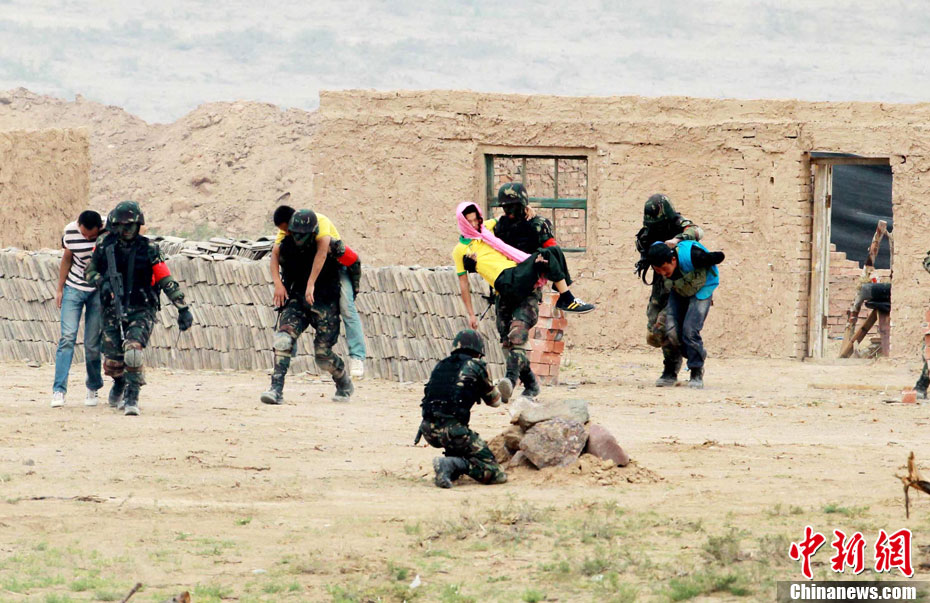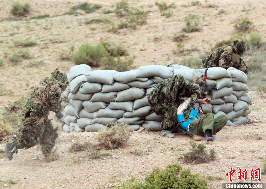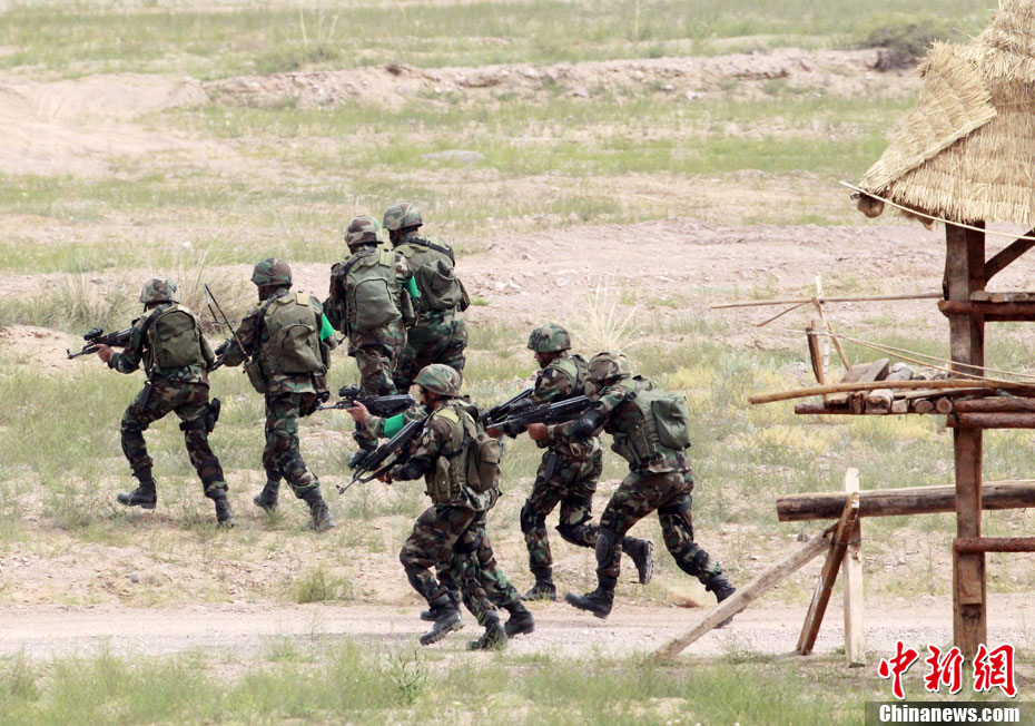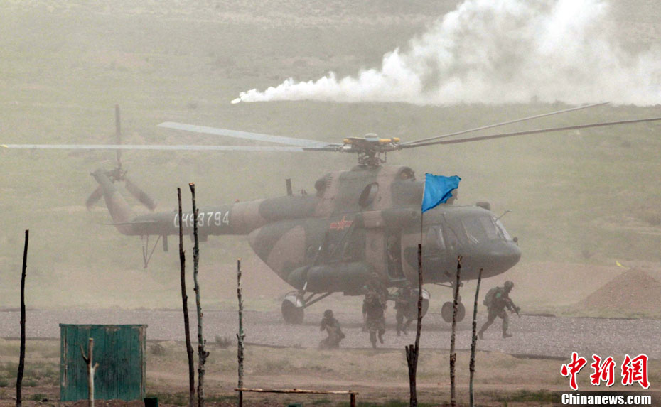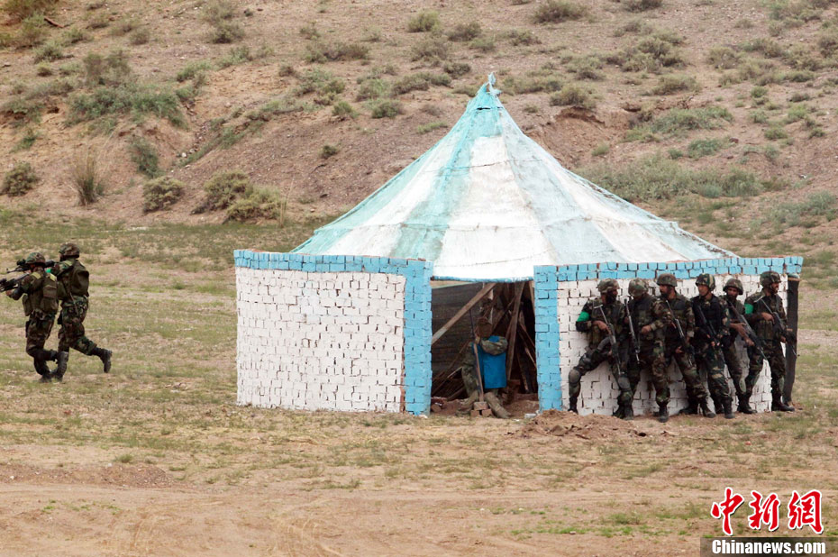 7月9日,友誼-2010”中巴反恐聯(lián)訓(xùn)在蘭州軍區(qū)某訓(xùn)練基地舉行實(shí)兵實(shí)彈演練,演練設(shè)計(jì)的背景是,對(duì)潛入中巴邊境地區(qū)實(shí)施襲擊破壞的國(guó)際恐怖分子進(jìn)行聯(lián)合打擊。圍繞“邊境地區(qū)山地聯(lián)合反恐作戰(zhàn)”這一課題,演練了遠(yuǎn)程投送、偵察監(jiān)視、立體封控、精確打擊、解救人質(zhì)、搜剿圍殲6個(gè)行動(dòng)。這次反恐聯(lián)演的一個(gè)亮點(diǎn),就是首次空地協(xié)同,聯(lián)合打擊,由地面反恐特戰(zhàn)人員引導(dǎo)殲轟機(jī)、武裝直升機(jī)實(shí)施空中火力突擊,采取精打要害的戰(zhàn)法,以建制內(nèi)的火器對(duì)恐怖分子營(yíng)地重要目標(biāo)實(shí)施火力打擊。中新社發(fā) 杜洋 攝