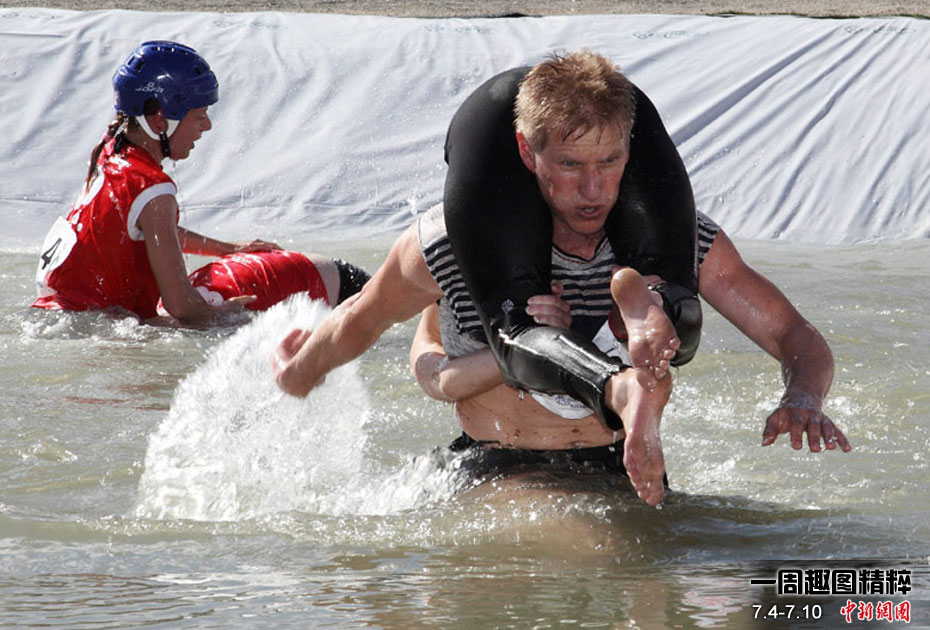 一年的一度的世界背老婆大賽在芬蘭中部小鎮(zhèn)松卡耶爾維舉行,參賽者背著自己的老婆在泳池里行走,最終來(lái)自芬蘭的一對(duì)選手最先通過(guò)終點(diǎn)。