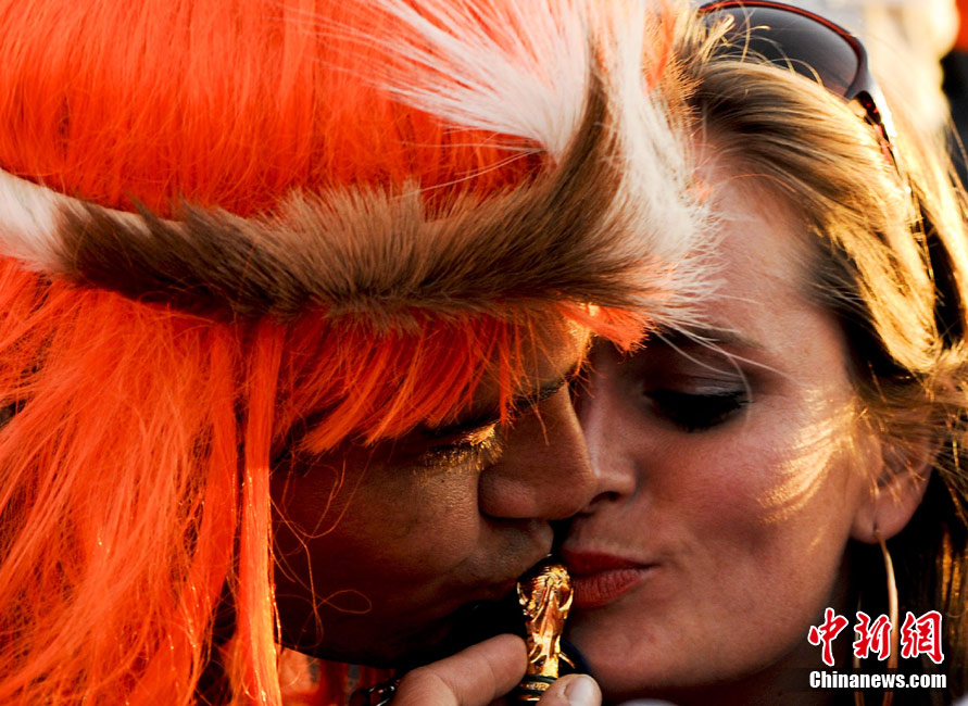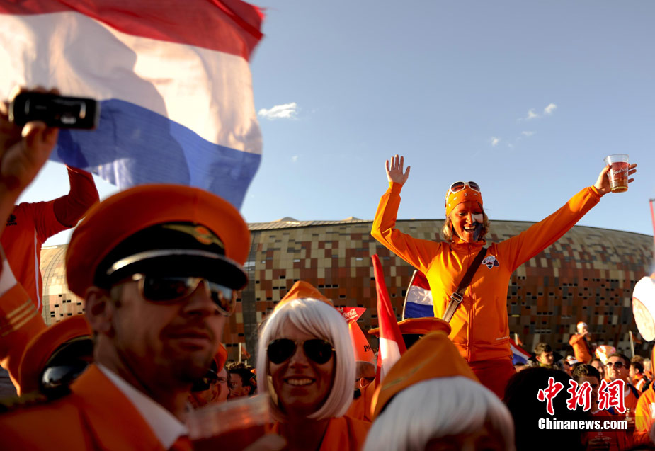 7月11日,南非約翰內斯堡足球城,眾多荷蘭球迷在足球城球場外激情舞蹈。當晚,南非世界杯荷蘭對西班牙的決賽將在足球城球場舉行。中新社記者 廖攀 攝