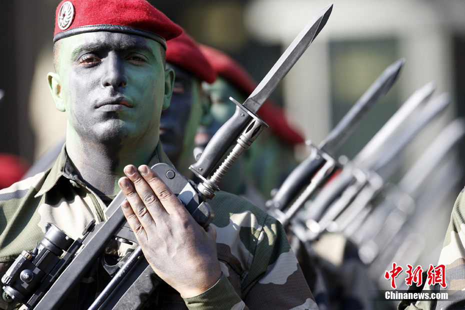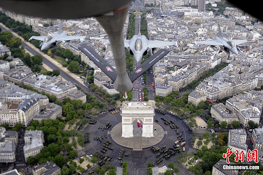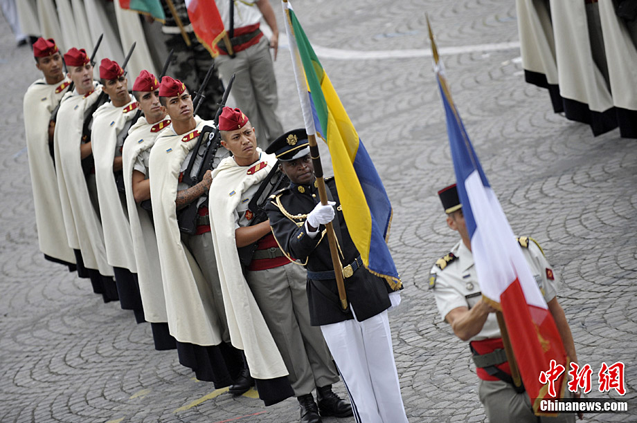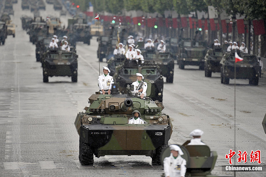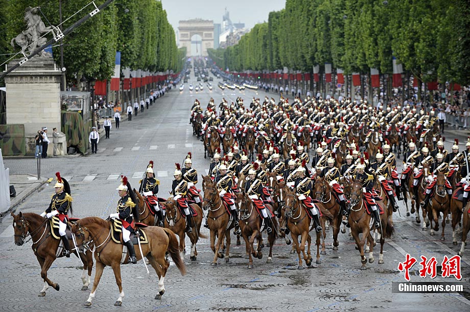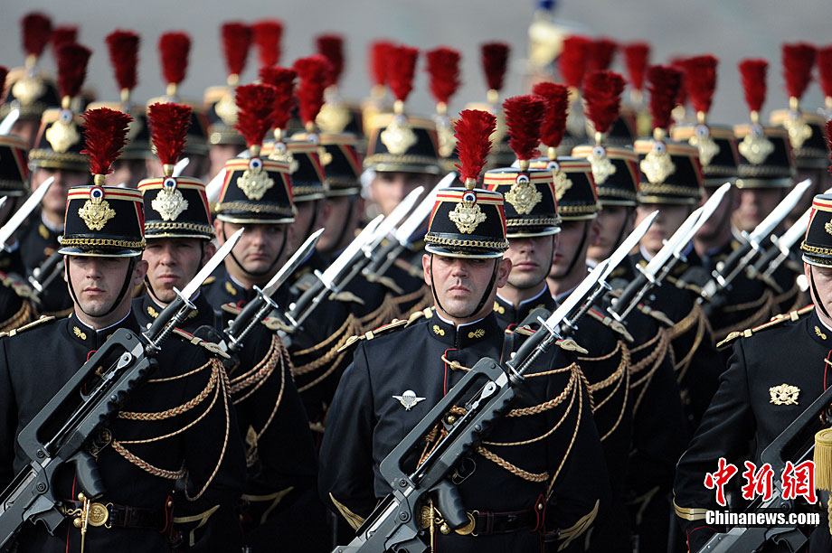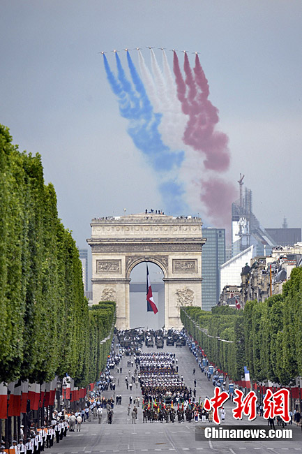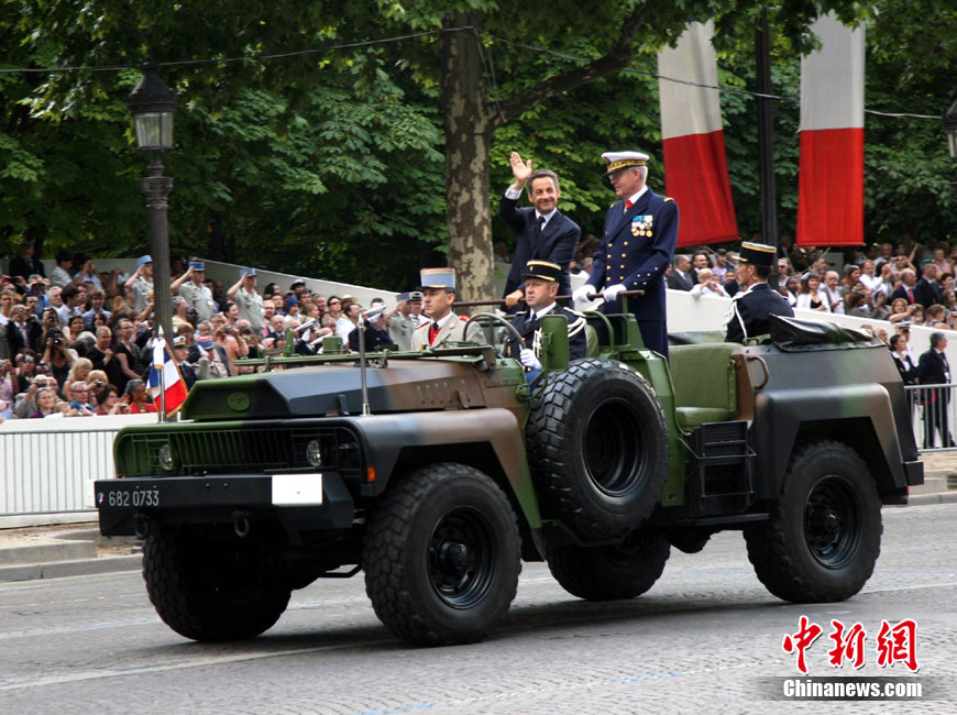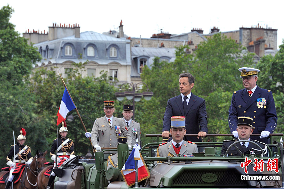 當(dāng)?shù)貢r(shí)間7月14日,法國(guó)巴黎舉行了盛大的國(guó)慶日閱兵式。圖為法國(guó)總統(tǒng)薩科齊在法國(guó)三軍總參謀長(zhǎng)愛(ài)德華·紀(jì)堯的陪同下檢閱部隊(duì)。 中新社發(fā) 吳衛(wèi)中 攝