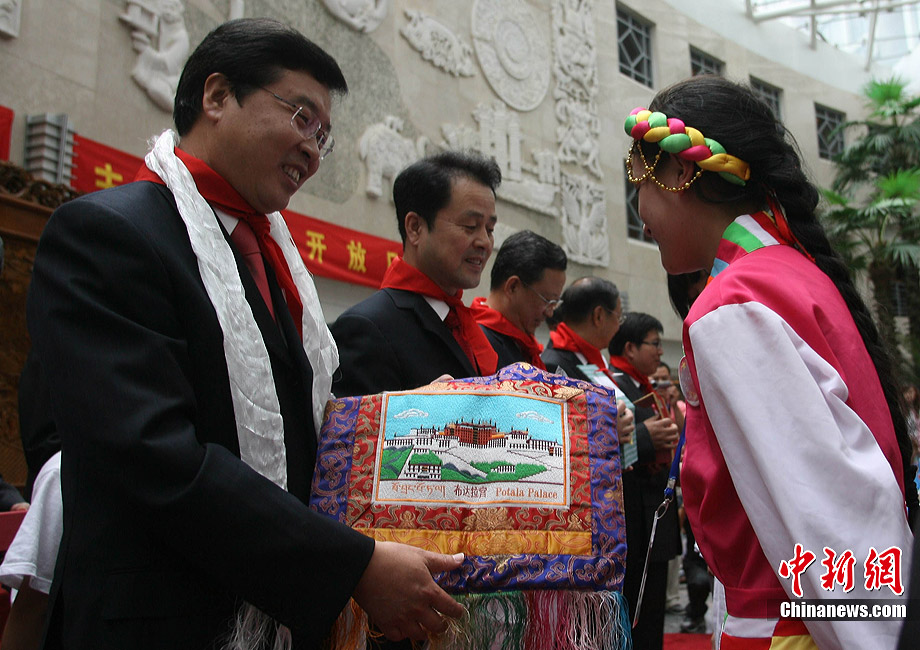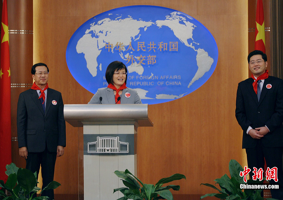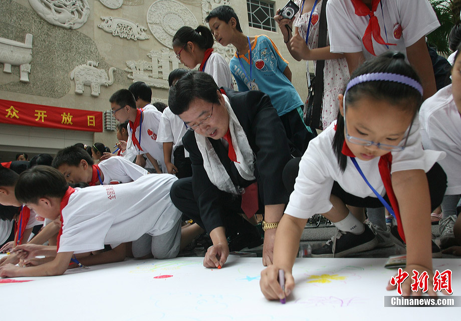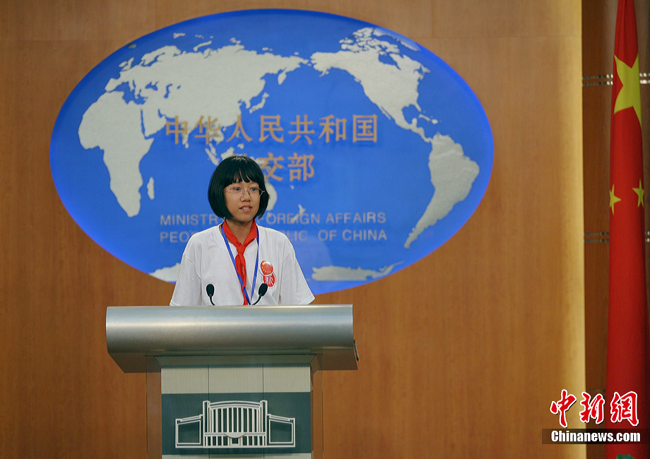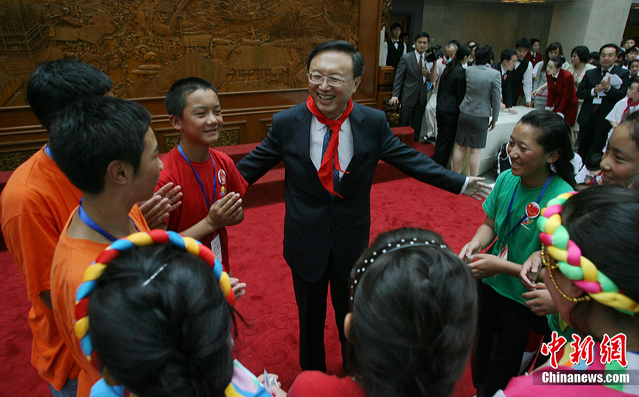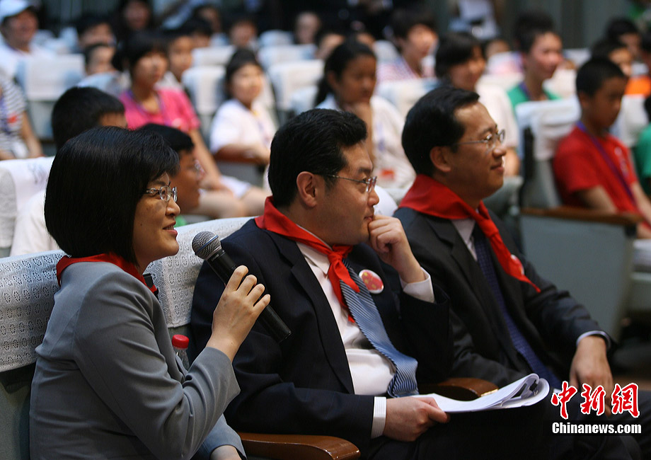 7月17日,在外交部橄欖廳,外交部長(zhǎng)楊潔篪勉勵(lì)玉樹震區(qū)小學(xué)生努力學(xué)習(xí)、重建家園。當(dāng)日,外交部舉辦第八次駐外使節(jié)任職宣誓儀式暨外交部“祖國(guó)在我心中”主題公眾開放日。來(lái)自北京、玉樹、黑龍江、重慶等地的小學(xué)生參加了此次活動(dòng)。中新社發(fā) 蘇丹 攝