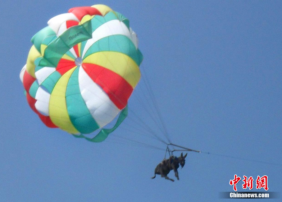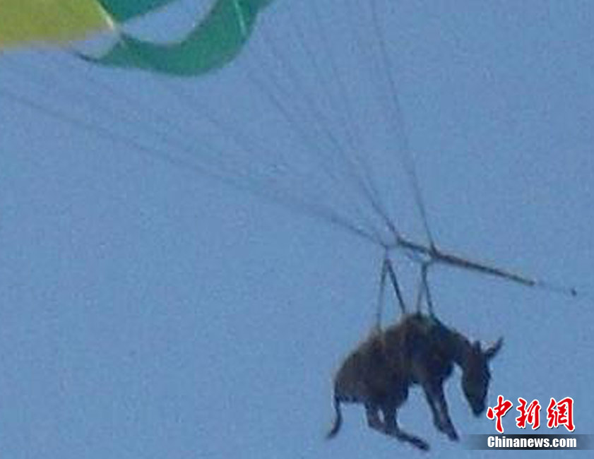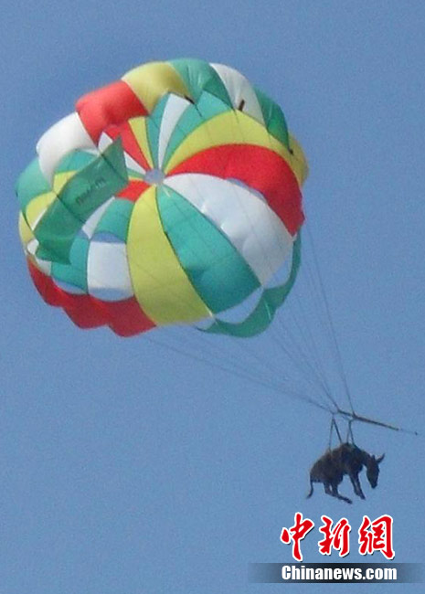俄羅斯警方于20日表示,上周在俄羅斯東部亞速海岸,游客及當地民眾從湛藍的天空中看到了驚人的一幕:一頭身上綁著降落傘的毛驢正在天上繞著圈圈!Q,當時這頭毛驢因為驚恐,而破嗓大叫。