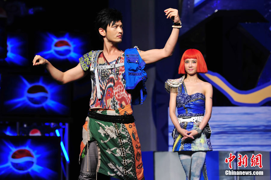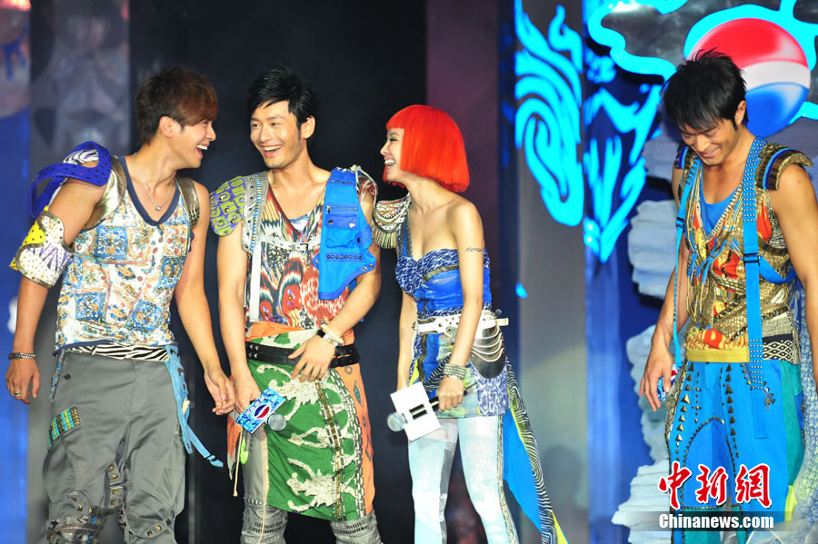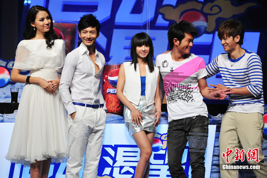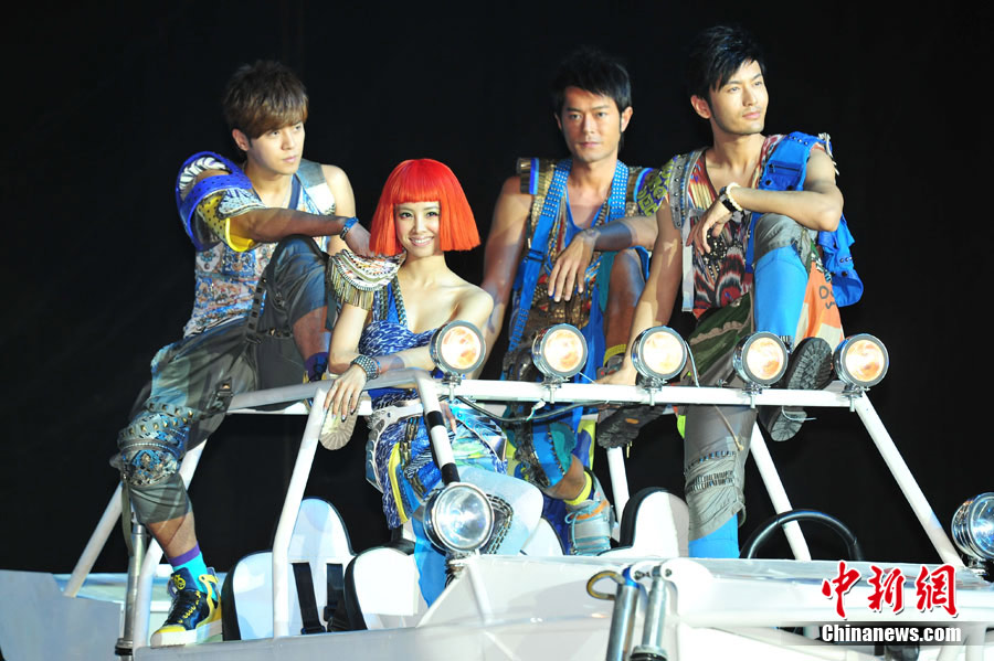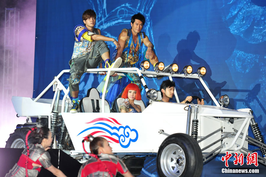 7月21日,國(guó)際某飲料巨頭在北京召開(kāi)新聞發(fā)布會(huì),最新主題廣告震撼首播。古天樂(lè)、羅志祥、黃曉明、蔡依林身著華麗戰(zhàn)袍駕駛戰(zhàn)車(chē)亮相,他們以師兄弟的身份打造全新“西游記”,“世界小姐選美大賽冠軍”張梓琳更是以蜘蛛精身份出演。中新社記者 富田 李學(xué)仕 攝