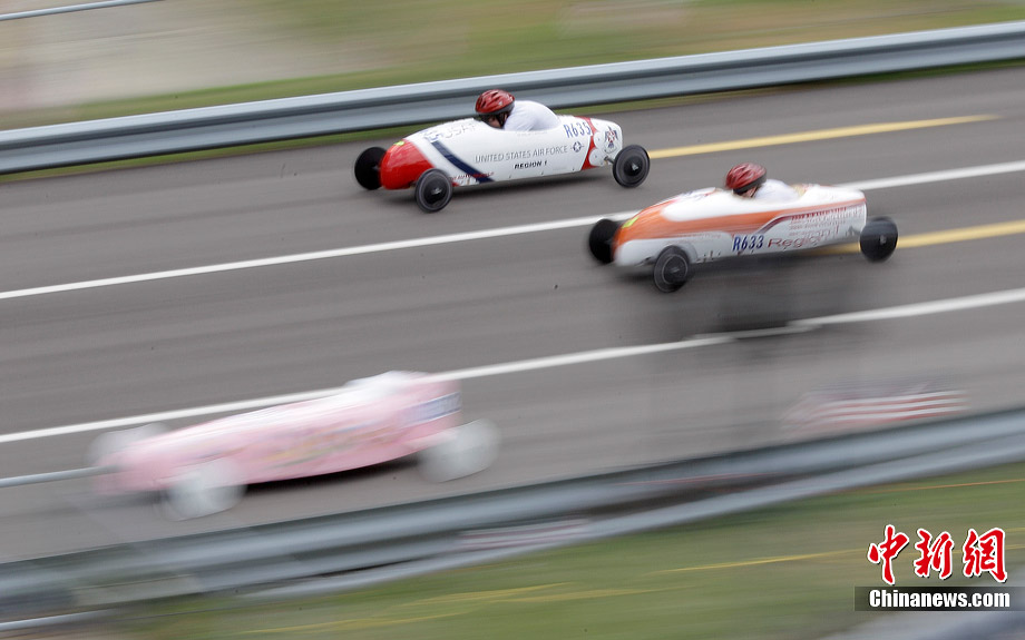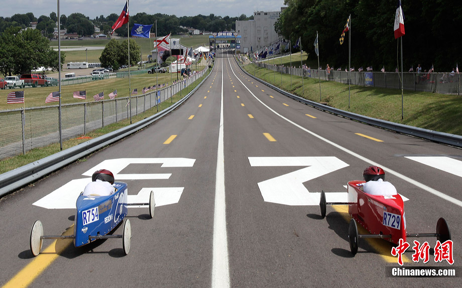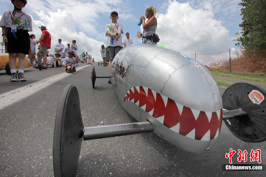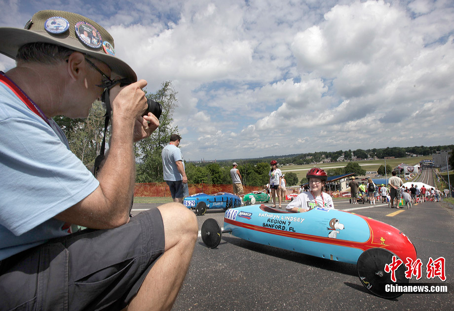當(dāng)?shù)貢r(shí)間7月21日,美國(guó)俄亥俄州舉行了第73屆全美“肥皂盒”小車大賽。來(lái)自美國(guó)各地以及加拿大、日本、德國(guó)和新西蘭的約500名車手?jǐn)y帶自己的愛(ài)車參賽!胺试砗小毙≤嚊](méi)有任何動(dòng)力裝置,其主要設(shè)計(jì)目標(biāo)是減少空氣阻力和摩擦力,以便讓小車的速度達(dá)到最高。