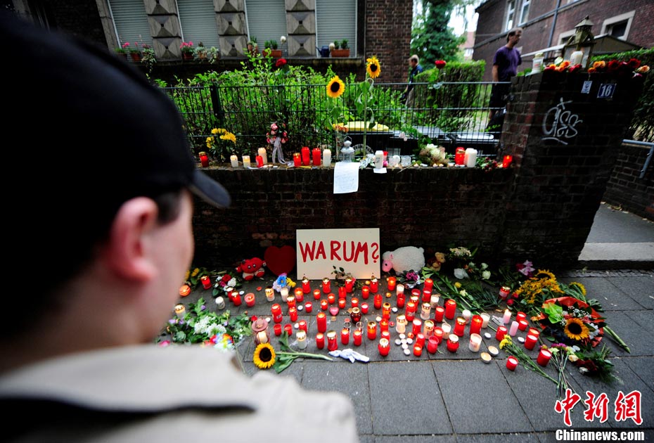 當(dāng)?shù)貢r(shí)間7月25日,德國(guó)西部杜伊斯堡街頭,民眾為遇難者獻(xiàn)上鮮花和蠟燭表示哀悼。牌子上的德語(yǔ)寫著“為什么”。