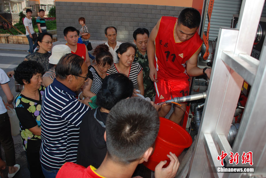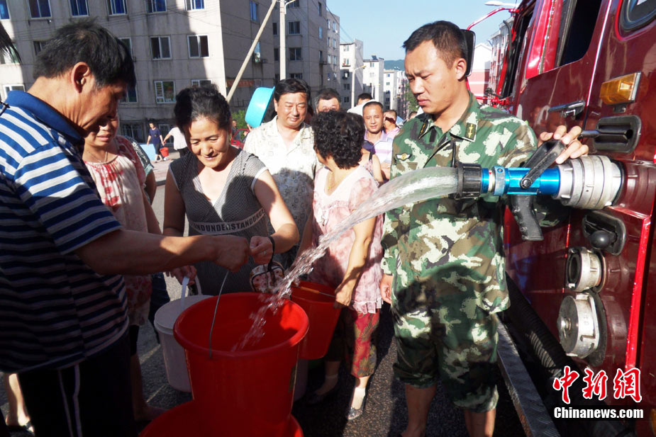 從7月31日吉林通化市內(nèi)全部供水管線被洪水沖毀到現(xiàn)在,33萬居民斷水時(shí)間已經(jīng)超過60小時(shí)。 8月3日通化市派出消防車輛給居民運(yùn)送生活用水的工作仍將繼續(xù),時(shí)間有望從早5點(diǎn)到晚六點(diǎn)延長到晚8點(diǎn),送水量也不會(huì)少于180臺(tái)次、1700噸水。同時(shí),當(dāng)?shù)匦l(wèi)生防疫部門對使用自用水的飯店進(jìn)行了嚴(yán)格監(jiān)督、檢查和登記,目前,沒有發(fā)現(xiàn)水質(zhì)問題,也沒有食物中毒現(xiàn)象發(fā)生。中新社發(fā) 王孝偉 攝 來源:CNSPHOTO