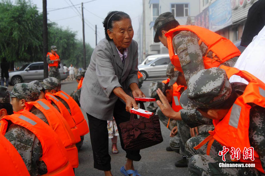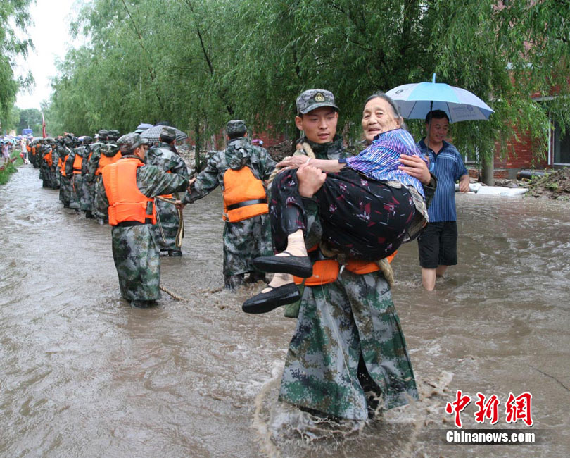 28日以來的一場暴雨讓吉林省多個地區(qū)遭遇罕見洪災(zāi),此后對災(zāi)區(qū)的救援緊張進(jìn)行。目前在永吉縣口前鎮(zhèn),已有部分商戶恢復(fù)營業(yè)。圖為在重災(zāi)區(qū)永吉縣,士兵將一名老婦轉(zhuǎn)移到安全地帶。中新社記者 張杰 攝
