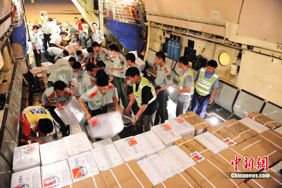 8月3日深夜,中國政府緊急援助巴基斯坦人道主義物資在河北省石家莊機場連夜裝機,準備于4日通過中國空軍飛機運往伊斯蘭堡。這批物資包括30噸藥品和凈水設備、1000頂帳篷、50臺發(fā)電機等,總價值約1000萬元人民幣。 中新社發(fā) 侯宇 攝