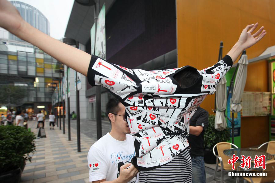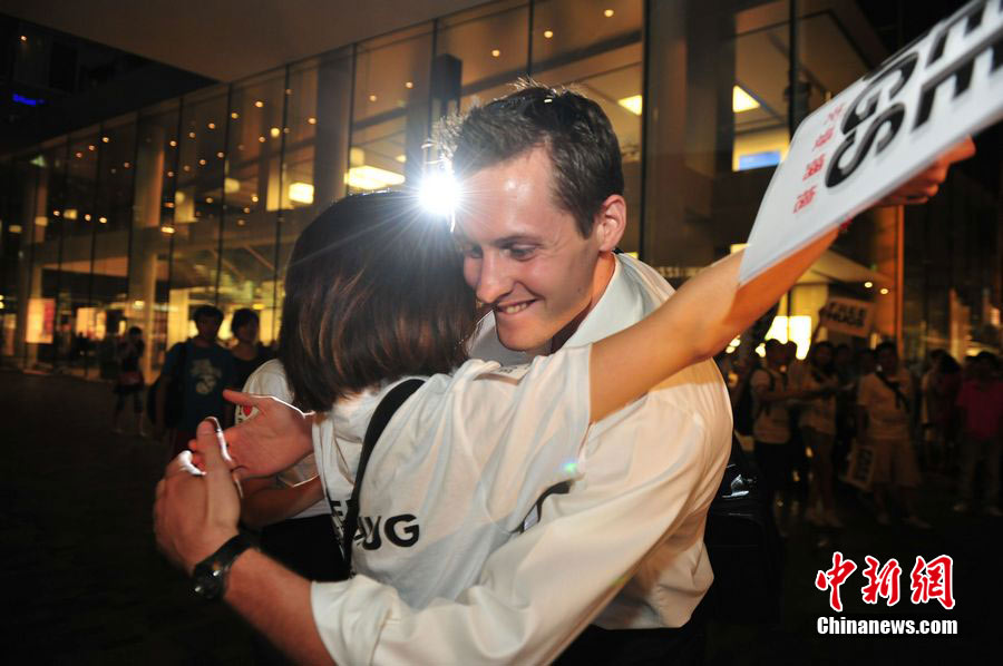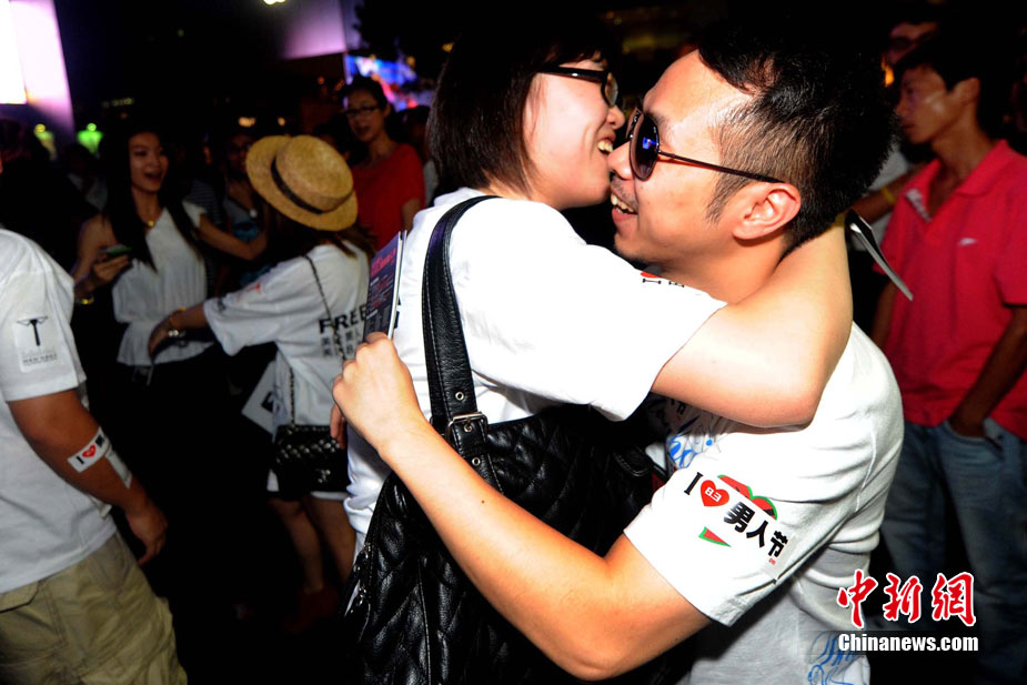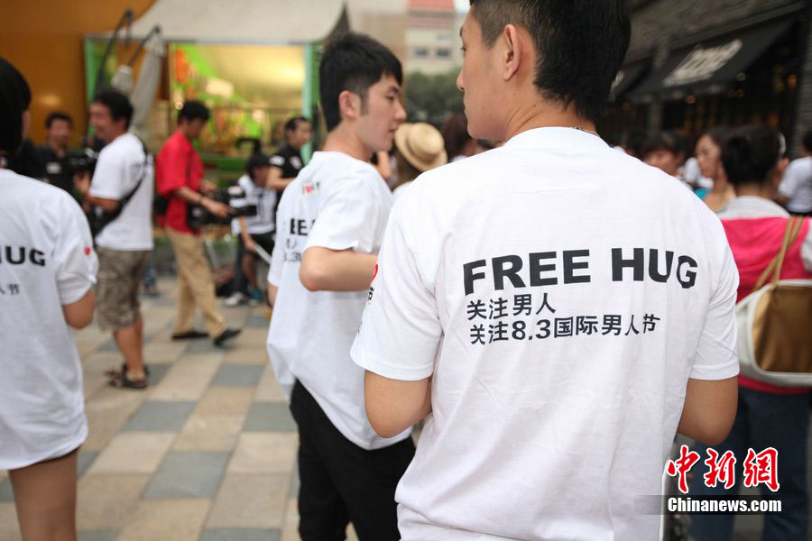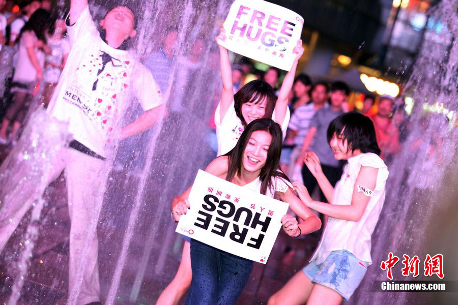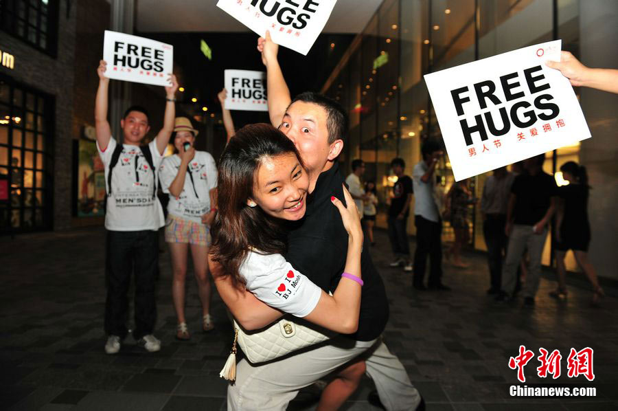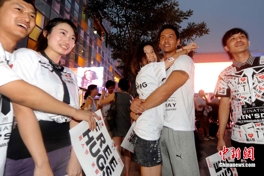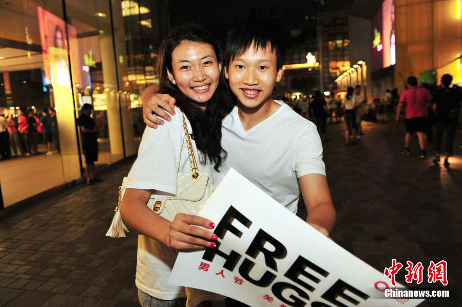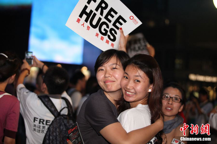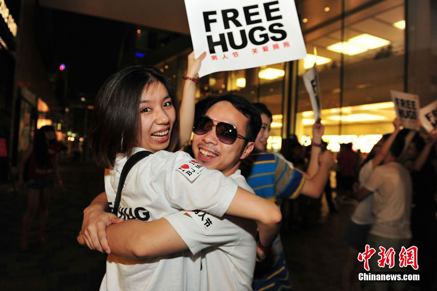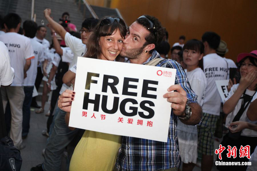 8月3日晚,在北京三里屯,俊男靚女們舉起Free Hug(免費(fèi)的擁抱)的大牌子,向陌生人們發(fā)起了自由擁抱的邀請(qǐng),現(xiàn)場(chǎng)千人不分男女老少相互擁抱致意!癋ree Hug”活動(dòng)起源于歐美,是一種倡導(dǎo)關(guān)心和理解的交流方式。中新社發(fā) 李學(xué)仕 攝