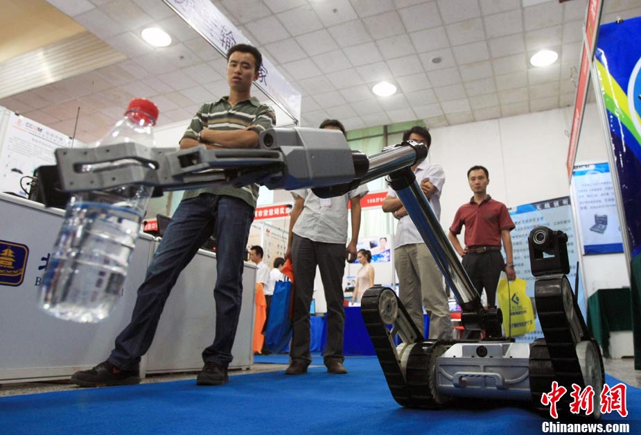 8月4日,2010新疆警用技術(shù)裝備暨社會(huì)公共安全產(chǎn)品博覽會(huì)(簡(jiǎn)稱(chēng)安博會(huì))在烏魯木齊開(kāi)幕,一部新型排爆機(jī)器人亮相本屆安博會(huì),現(xiàn)場(chǎng)抓起礦泉水瓶。據(jù)了解,本屆安博會(huì)吸引了來(lái)自美國(guó)、英國(guó)、意大利等國(guó)家和地區(qū)的安保設(shè)備生產(chǎn)企業(yè)前來(lái)參展,并匯集大批警用應(yīng)急指揮車(chē)、防爆摩托車(chē)、槍支武器、坦克車(chē)、智能機(jī)器人等平日不常見(jiàn)到的警用技術(shù)裝備,成為安博會(huì)開(kāi)辦以來(lái)規(guī)模最大、參展產(chǎn)品最多樣的一次盛會(huì),令到場(chǎng)參觀民眾大開(kāi)眼界。中新社發(fā) 劉新 攝
