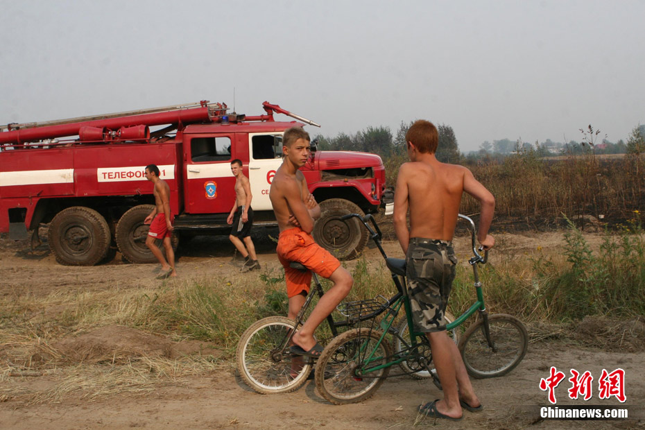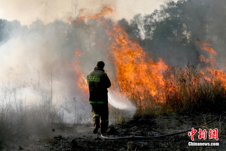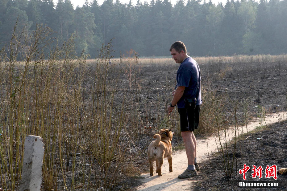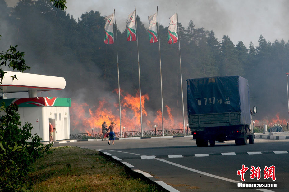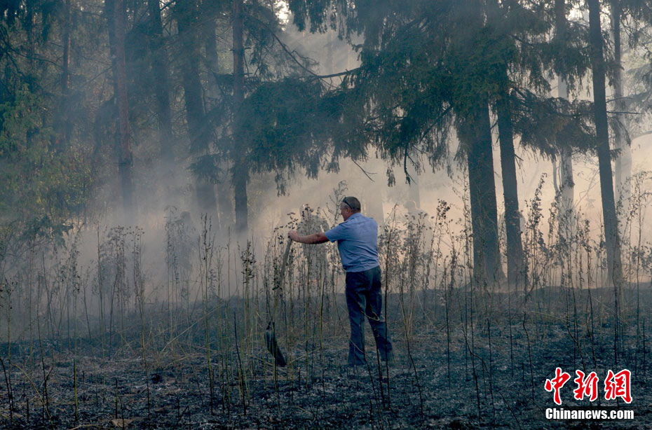 8月5日,在距離莫斯科市區(qū)僅15公里處的一家加油站附近突然燃起森林大火,情勢非常危急。當(dāng)?shù)孛癖娮园l(fā)與消防人員全力滅火。中新社發(fā) 田冰 攝