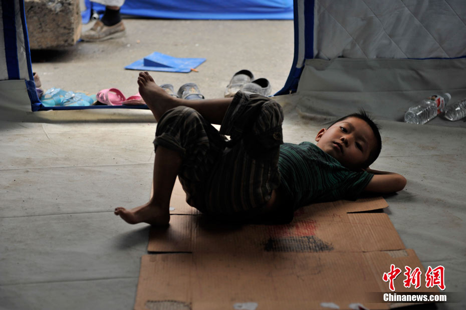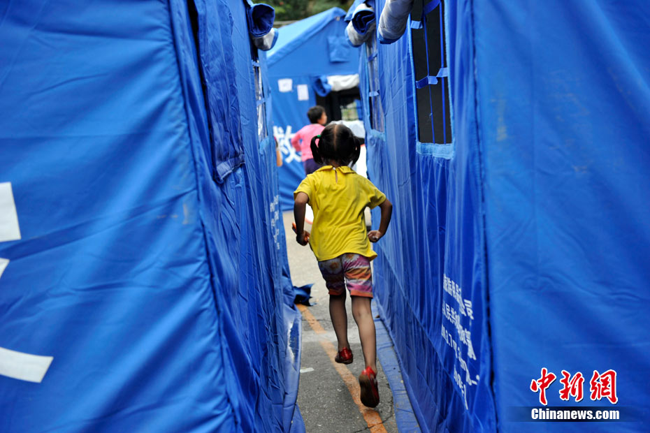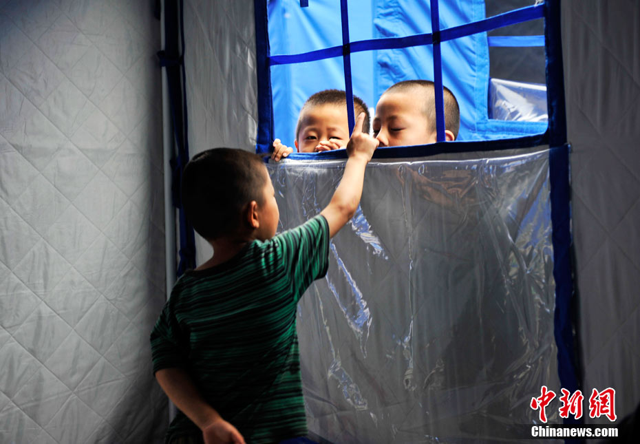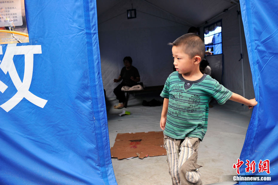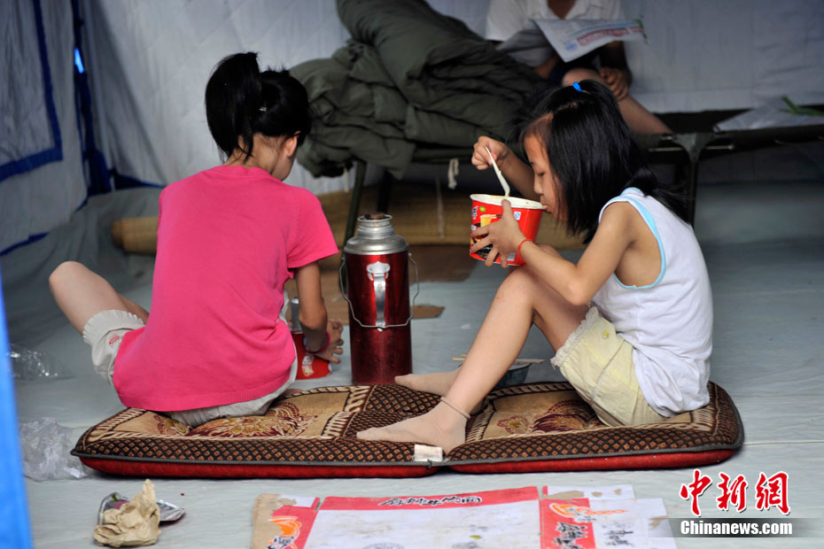 8月12日,甘肅舟曲災(zāi)區(qū)受災(zāi)群眾安置點內(nèi)的孩子們。甘肅舟曲特大山洪泥石流災(zāi)害發(fā)生后的第5天,隨著救災(zāi)物資持續(xù)運進舟曲災(zāi)區(qū),臨時安置點的生活條件也逐漸得到改善,各類設(shè)施逐漸齊全,受災(zāi)群眾在這里重啟生活。中新網(wǎng)記者 金碩 攝