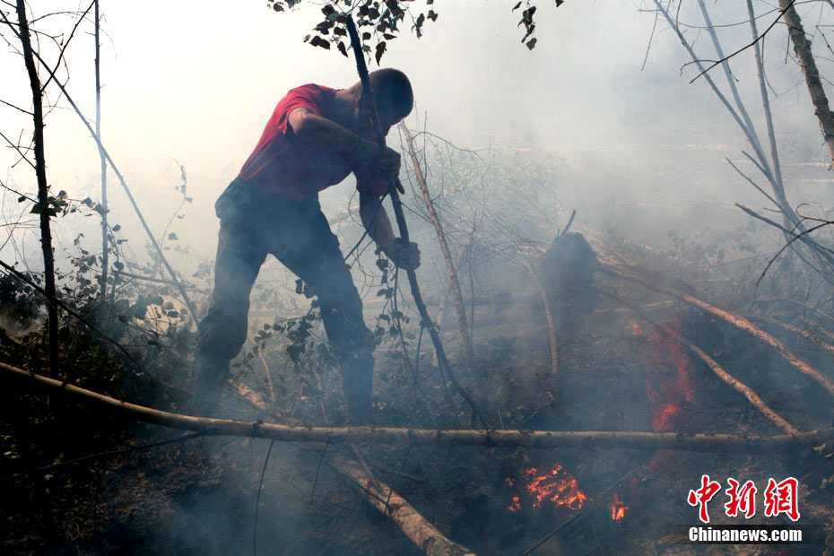 8月13日,在距莫斯科市140公里的莫斯科州沙圖拉區(qū)一村莊附近,刺鼻的煙霧繚繞中,村民用樹枝撲滅由泥炭燃燒產(chǎn)生的明火。目前該州大部分火災(zāi)被完全撲滅,但仍有29處火點(diǎn),面積達(dá)124公頃,其中12處為泥炭火災(zāi)。莫斯科周邊泥炭燃燒產(chǎn)生的濃煙被認(rèn)為是莫斯科市區(qū)煙霧的主要來源之一。中新社發(fā) 田冰 攝