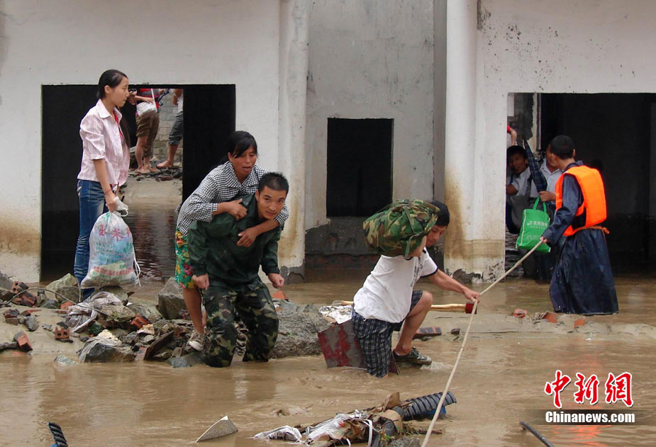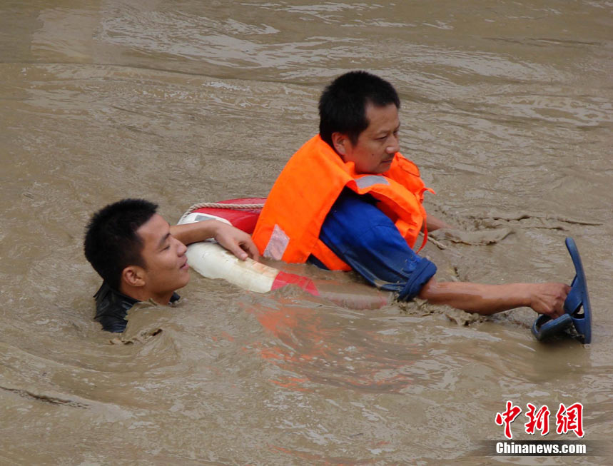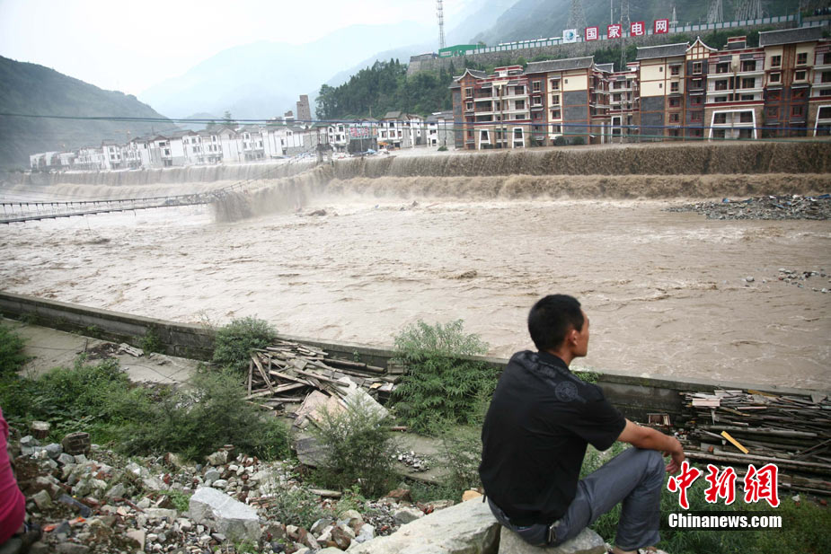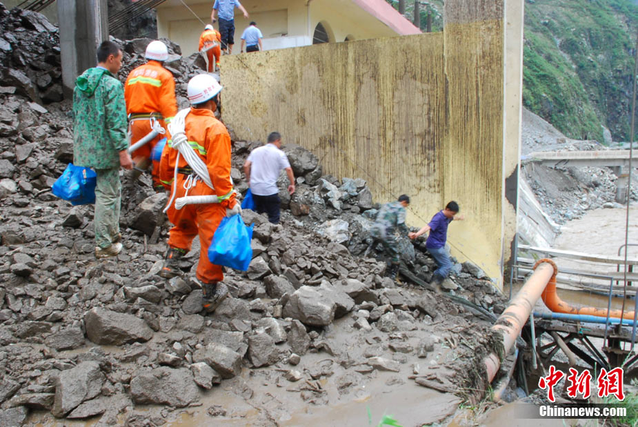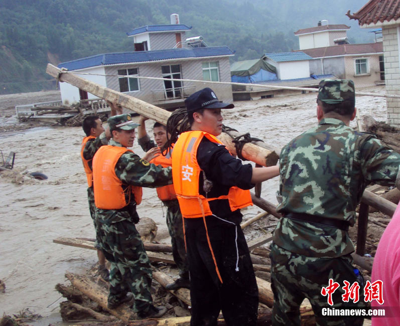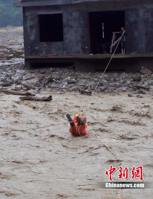 8月14日,“5.12”震中四川汶川映秀鎮(zhèn)遭遇洪澇泥石流災害,形成地質災害點16個,導致汶川38人失蹤。圖為消防官兵正在轉移被困民眾。 中新社發(fā) 沈消軒 攝