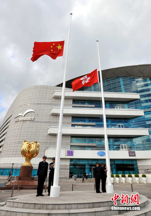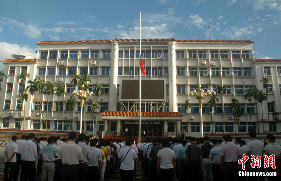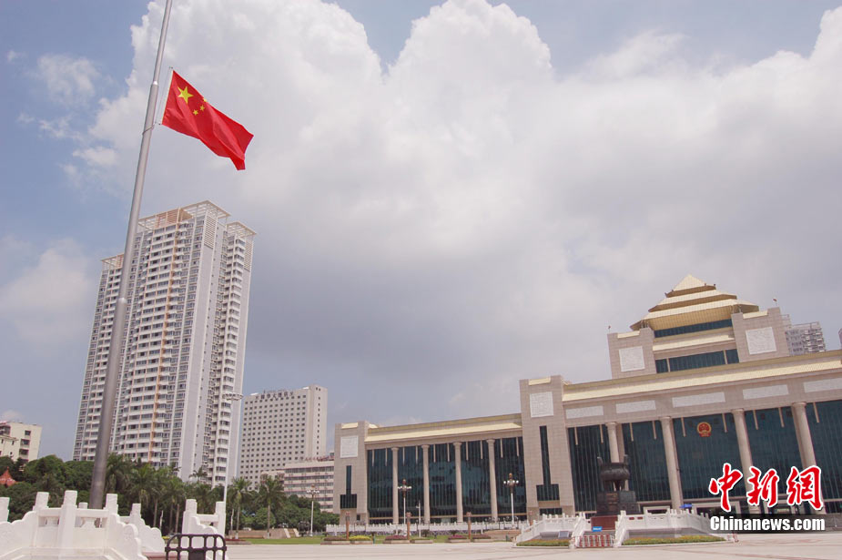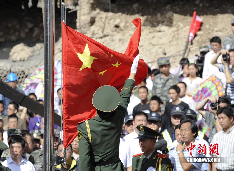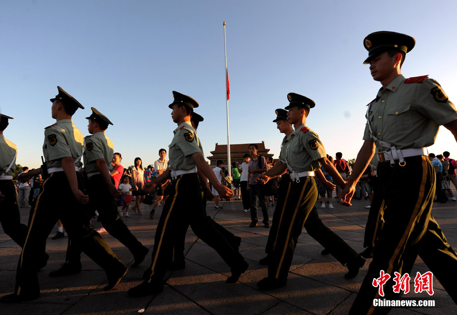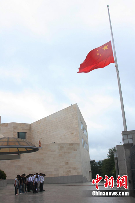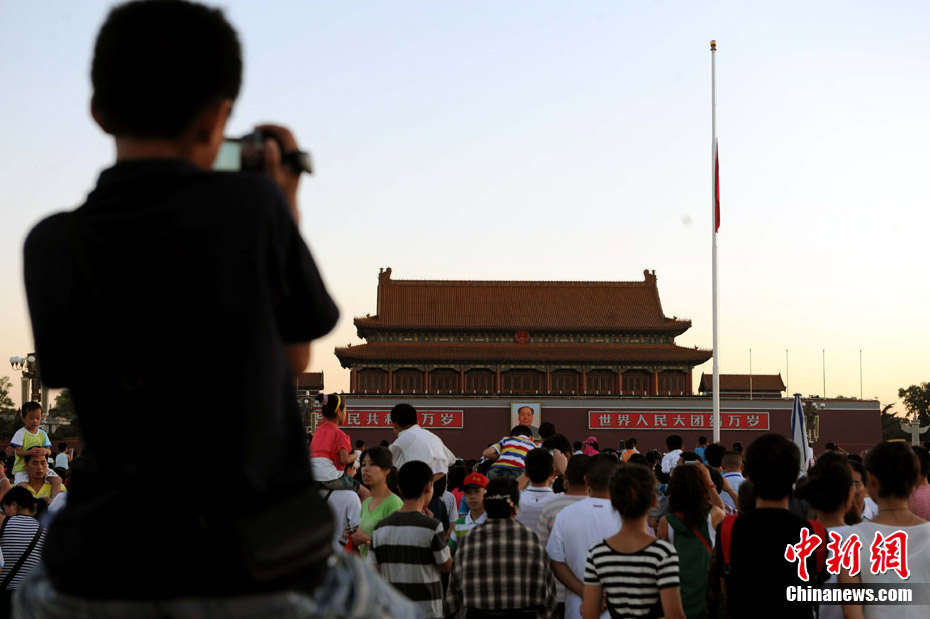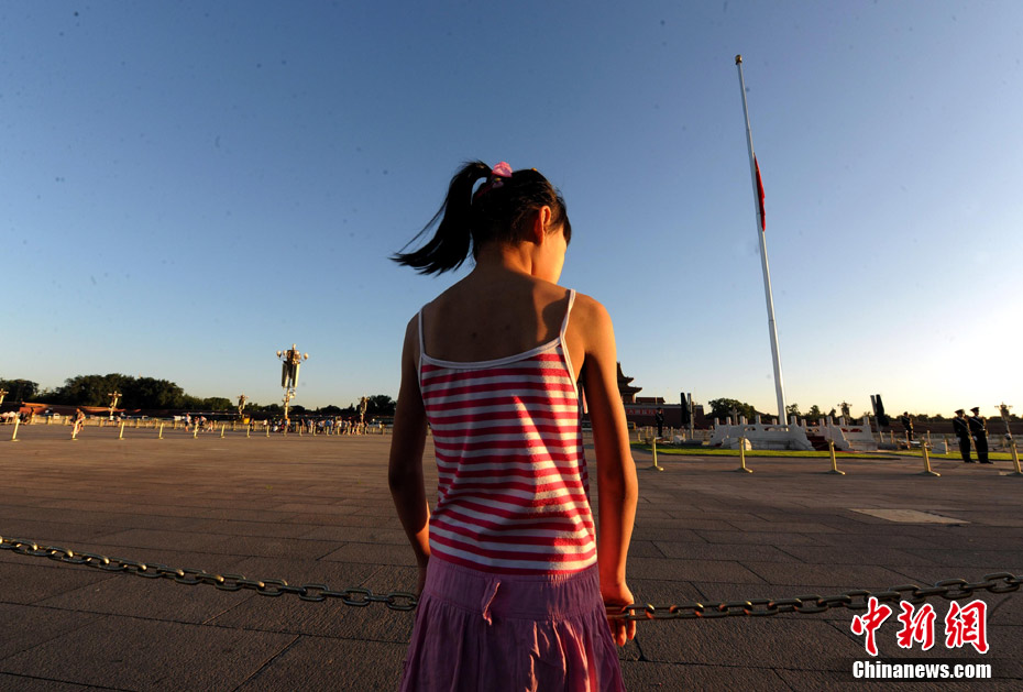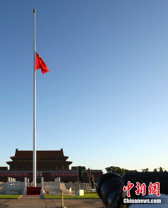 8月15日5時(shí)28分,天安門廣場(chǎng)下半旗,對(duì)甘肅舟曲特大山洪泥石流遇難同胞表示深切哀悼。這是繼2008年5月汶川地震和今年4月玉樹地震后,國旗第三度為普通國民而降。中新社記者 富田 攝