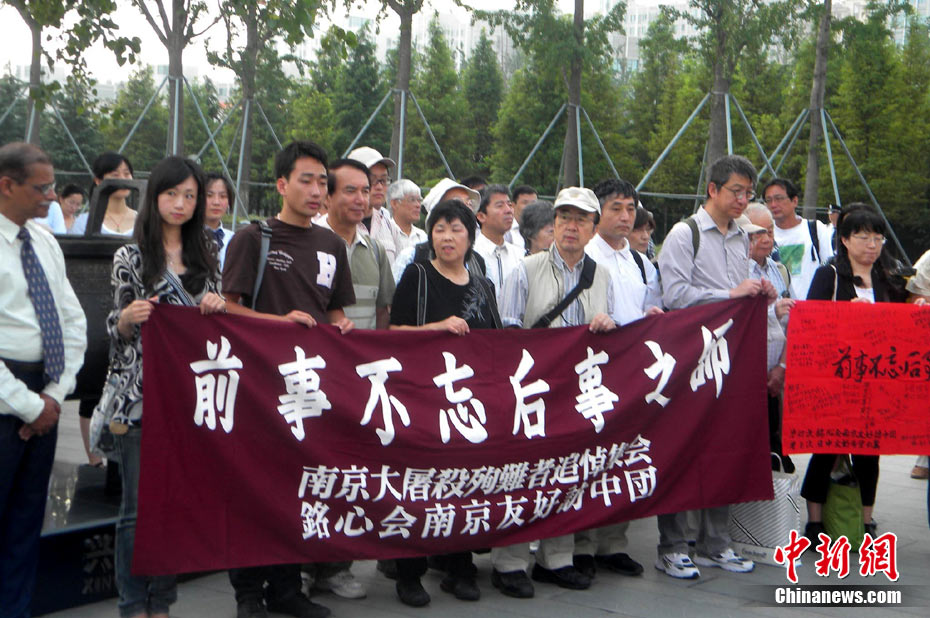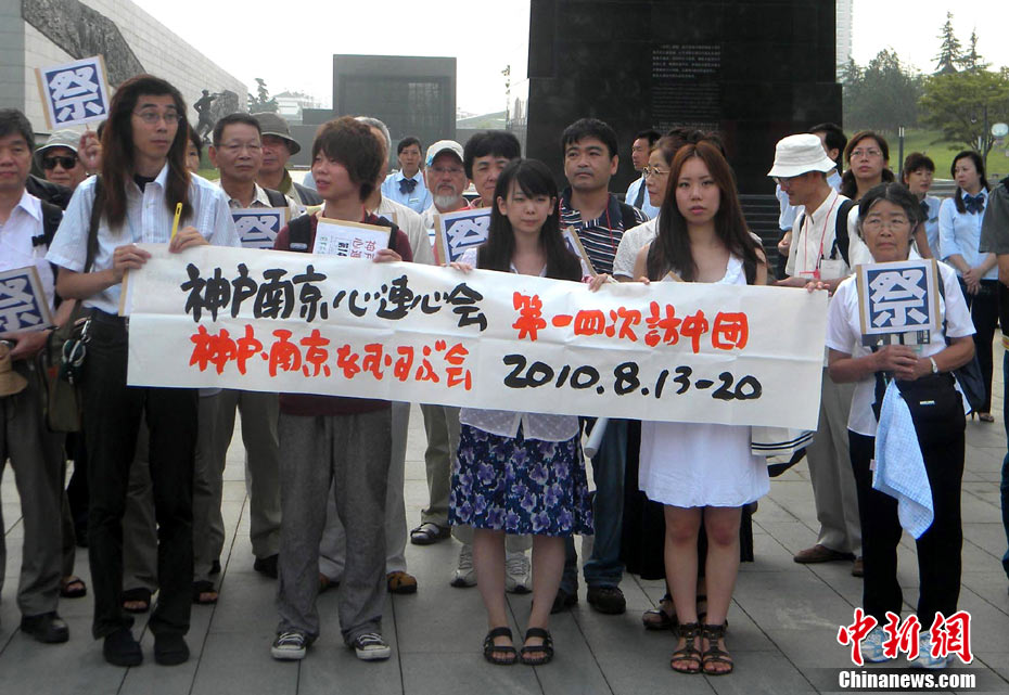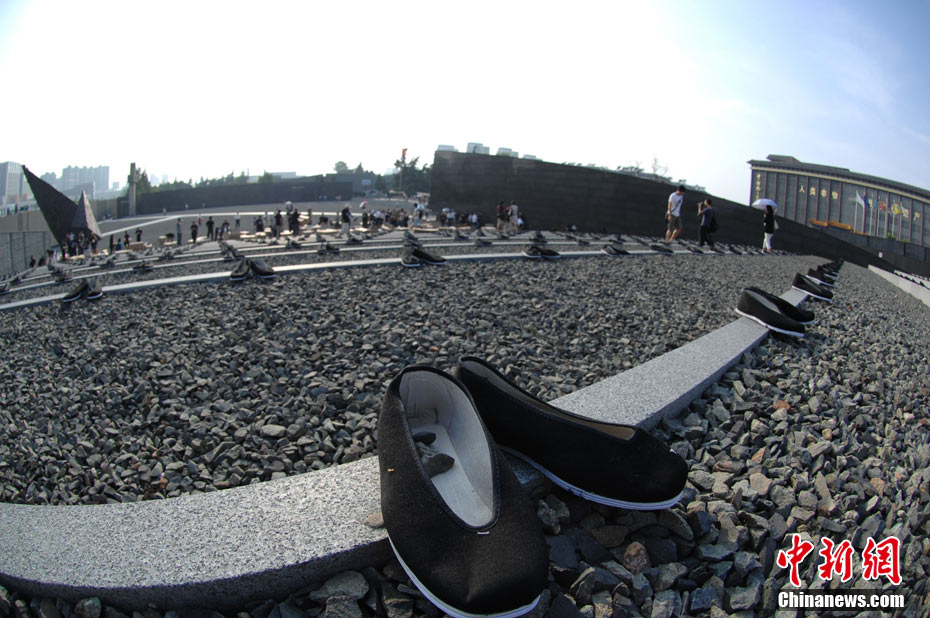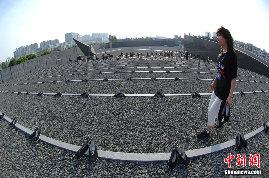 為紀念二戰(zhàn)期間在日本遇害的6830名被強擄的中國勞工,8月14日下午,在侵華日軍南京大屠殺遇難同胞紀念館廣場,被擄勞工中的幸存者及遇難者家屬、日本友人等近50人舉行了6830雙布鞋擺放活動。中新社發(fā) 江法 攝 圖片來源:cnsphoto