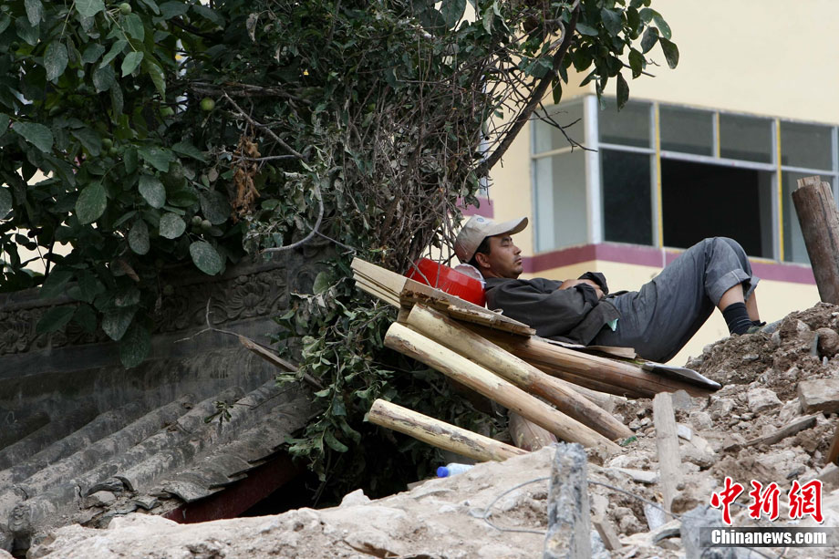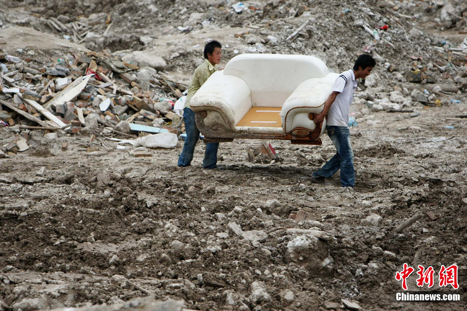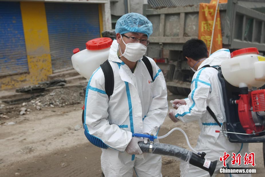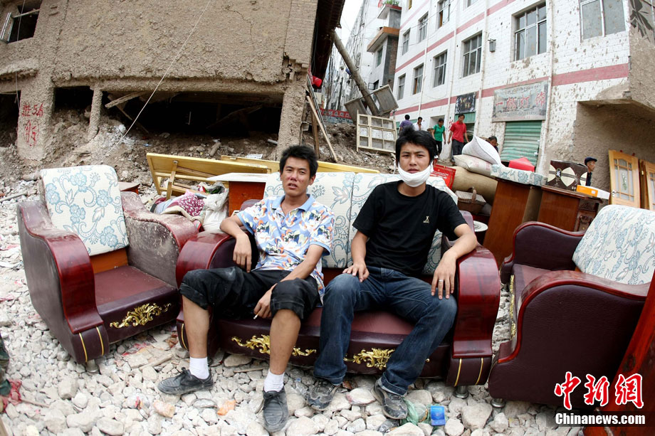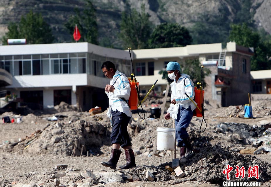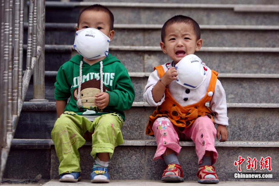 8月16日,甘肅舟曲泥石流災(zāi)區(qū),一歲大的女孩楊歡(左)、樂(lè)樂(lè)坐在臺(tái)階上,戴著大大口罩等待家人,楊歡的媽媽在這次特大泥石流災(zāi)害中不幸遇難。目前,舟曲災(zāi)區(qū)衛(wèi)生防疫工作在不斷加強(qiáng),防疫人員每天至少對(duì)安置點(diǎn)進(jìn)行1次全面消毒、殺蟲(chóng)。對(duì)于食堂、垃圾場(chǎng)等重點(diǎn)部位每天至少消毒殺菌3次以上。 中新社發(fā) 杜洋 攝
