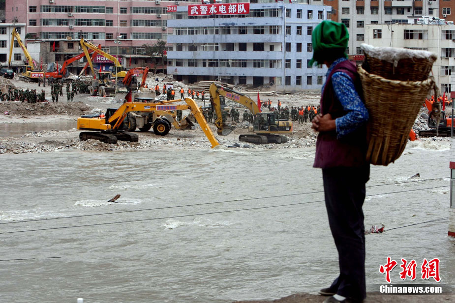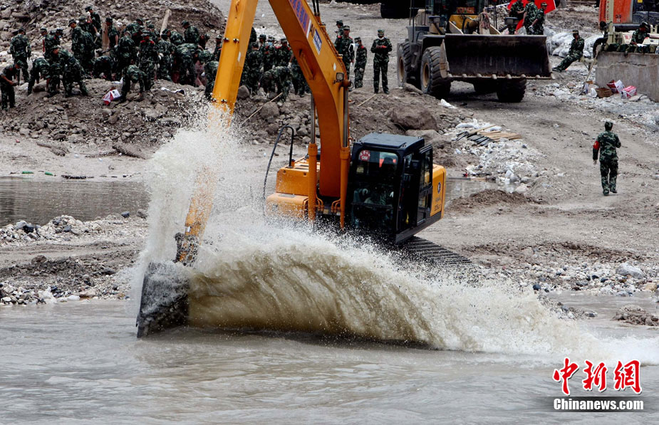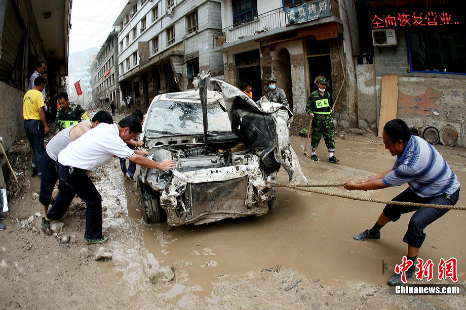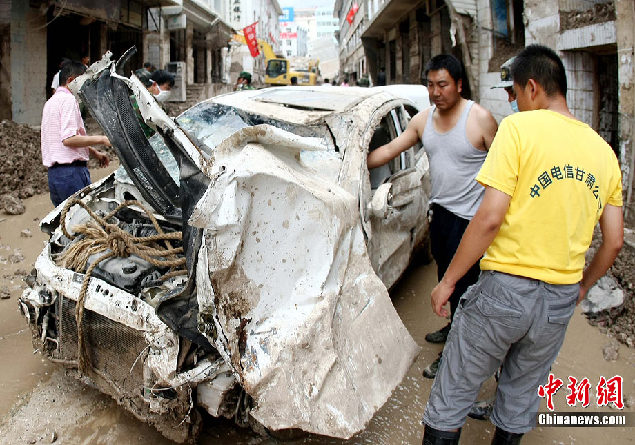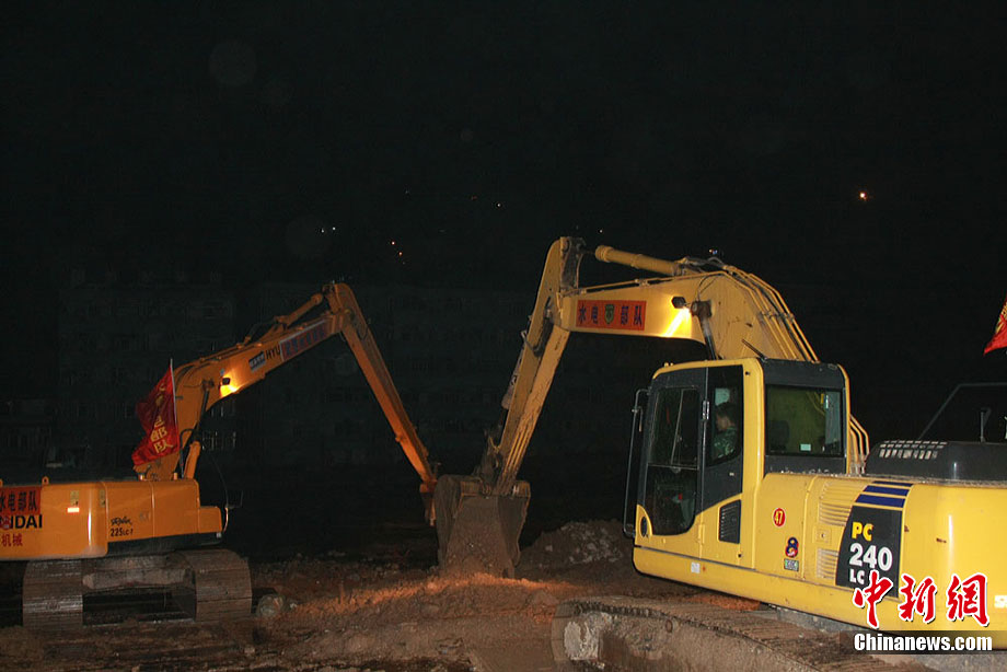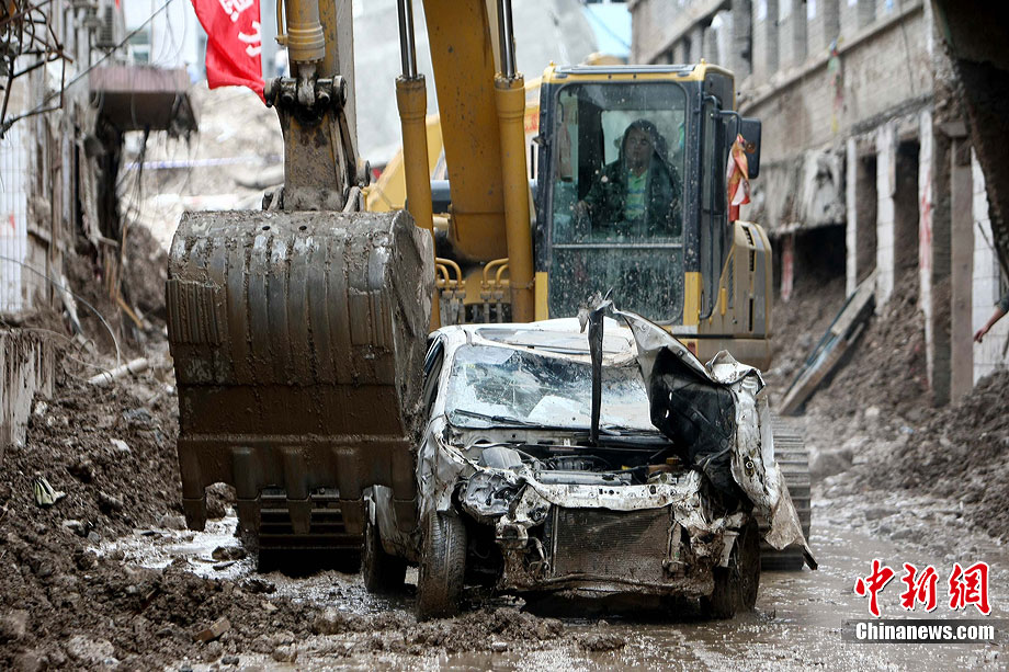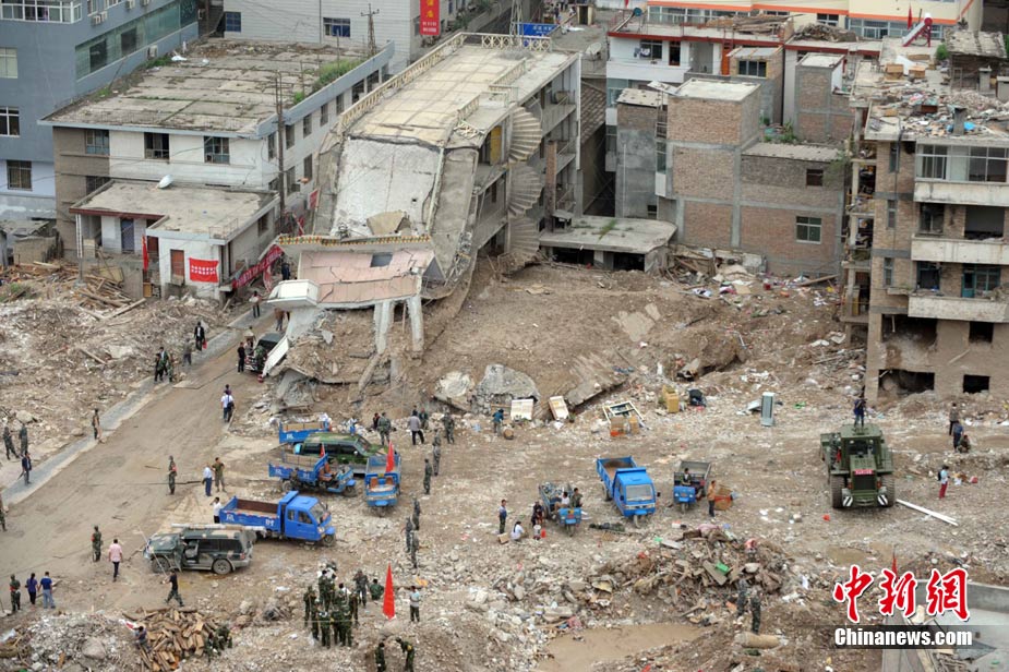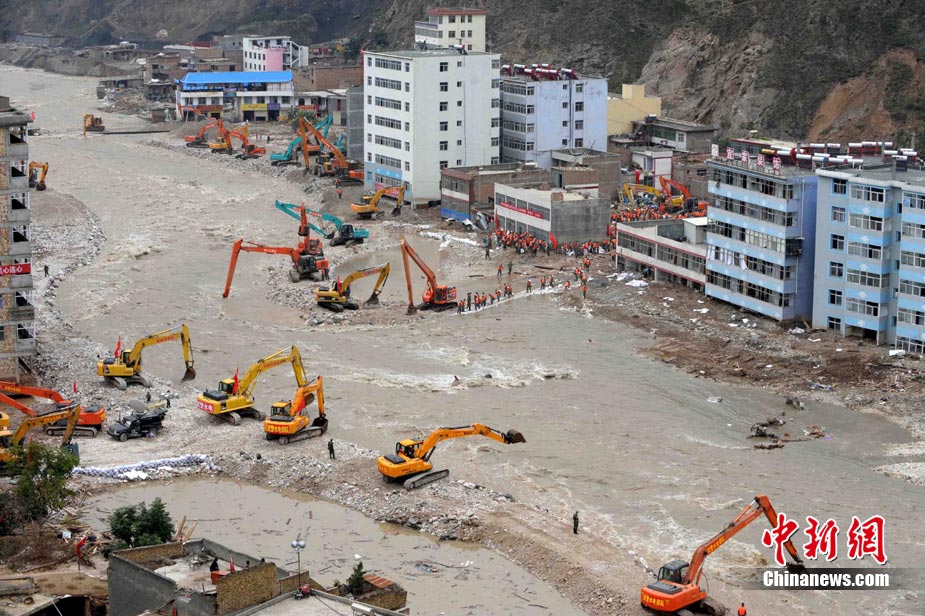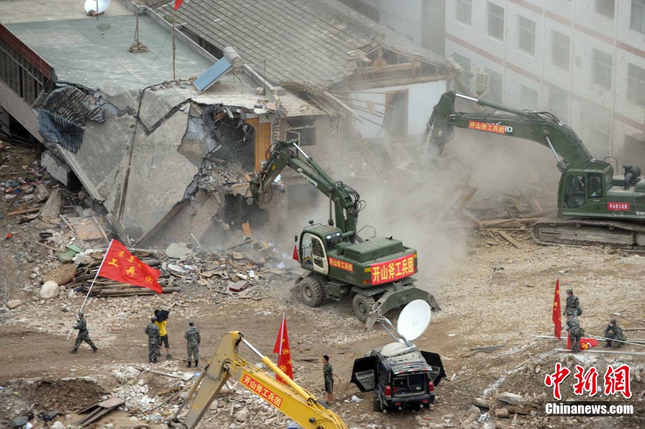 8月18日上午,由蘭州軍區(qū)某集團軍“開山斧工兵團”大型機械對舟曲特大山洪泥石流災害所致三眼峪重災區(qū)危樓進行拆除。中新社記者 陳文 攝