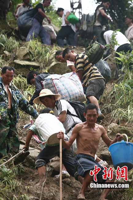 8月18日,汶川地區(qū)普降暴雨,岷江河水位再度上漲,由于汶川境內(nèi)213國道仍然處于中斷狀態(tài),受災(zāi)群眾依然只能徒步翻山越嶺撤離家園,部分山勢陡峭,群眾只能靠繩索通往。中新社發(fā) 張浪 攝