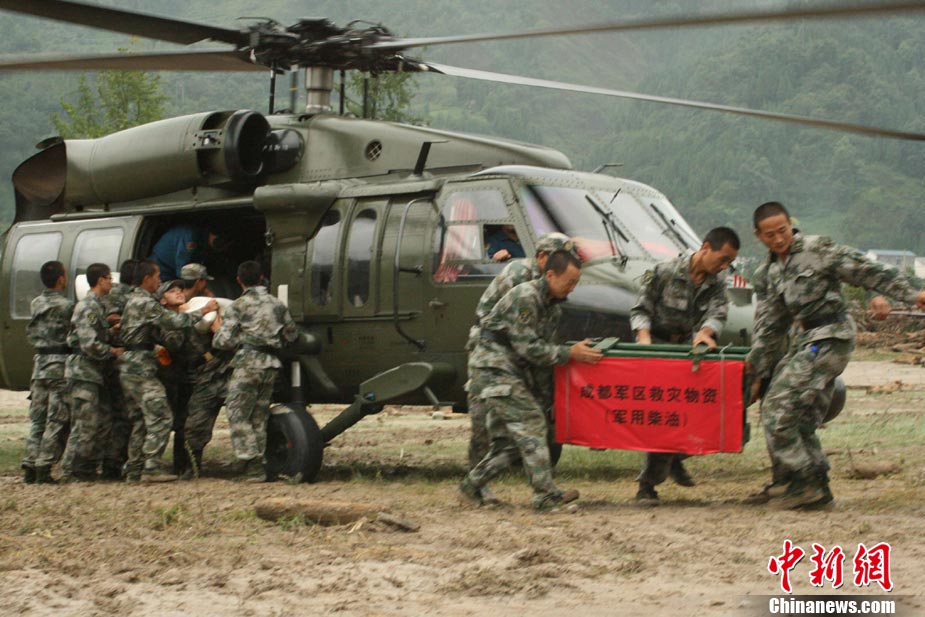 被中央軍委授予“抗震救災(zāi)英雄陸航團”榮譽稱號的成都軍區(qū)某陸航團,在綿竹清平鄉(xiāng)“8.13”特大山洪泥石流災(zāi)害發(fā)生后,連日來奮戰(zhàn)于災(zāi)區(qū),為清平架起“生命線”,承擔起為災(zāi)區(qū)運送各類救援人員,轉(zhuǎn)運災(zāi)區(qū)群眾,運輸救災(zāi)物資等任務(wù)。 圖為陸航團直升機為災(zāi)區(qū)空運來急需的重型機械設(shè)備所需油料。中新社發(fā) 高樂暢 攝