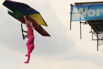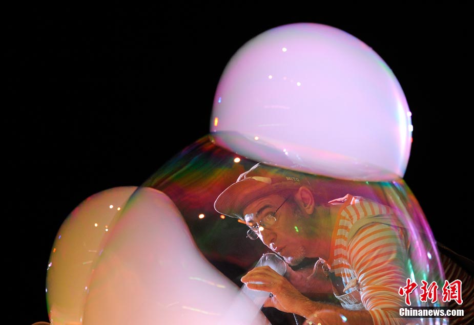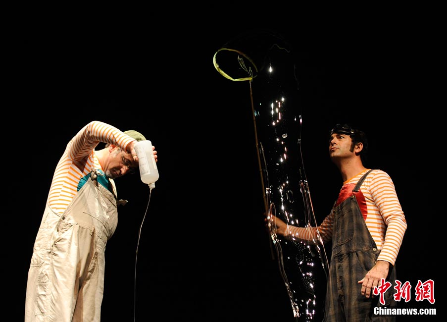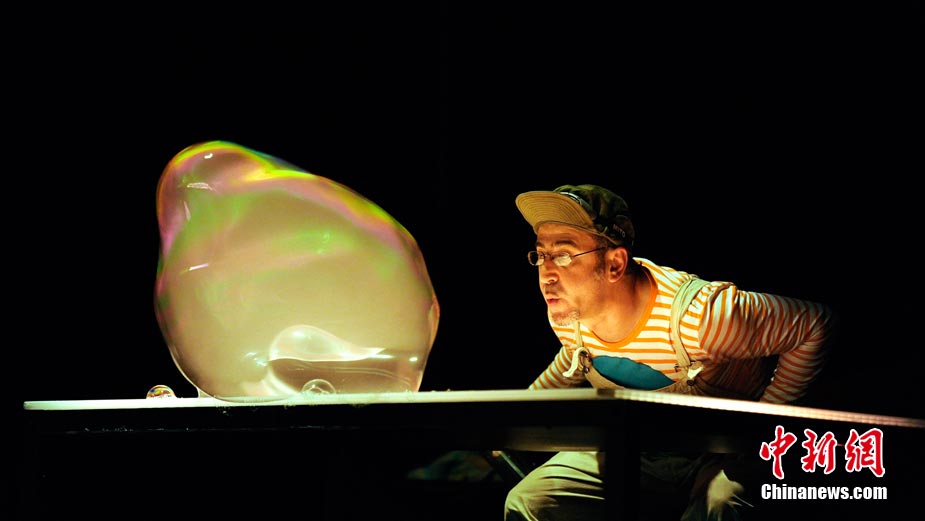 當(dāng)?shù)貢r(shí)間8月18日,西班牙馬德里,藝術(shù)家 Luis Bevia在舞臺(tái)上大!胺试砼菽g(shù)”。