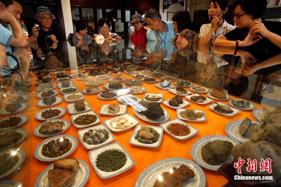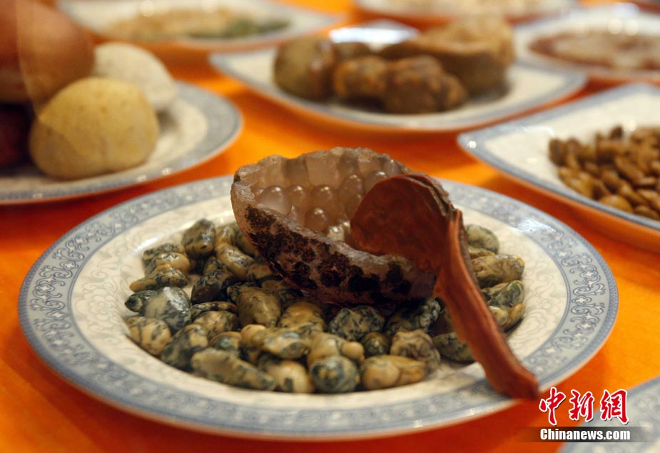 8月20日,游客在廣西柳州八桂奇石館欣賞“滿漢全席”。這些栩栩如生的各式奇石酷似美食佳肴,令游客垂涎欲滴。中新社記者 張宇 攝