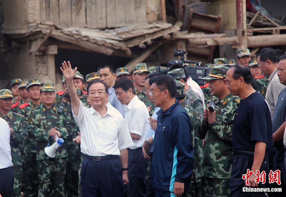 8月22日上午,中國國務院總理溫家寶第二次來到甘肅舟曲災區(qū),看望舟曲特大泥石流災害中受災的群眾。中新社發(fā) 龐紅升 攝
