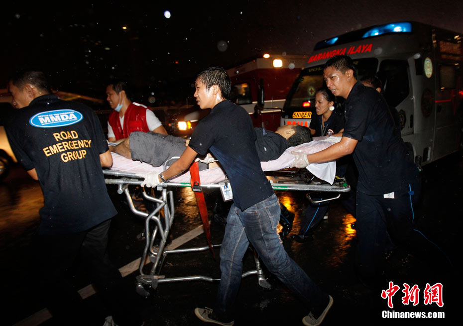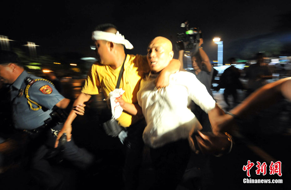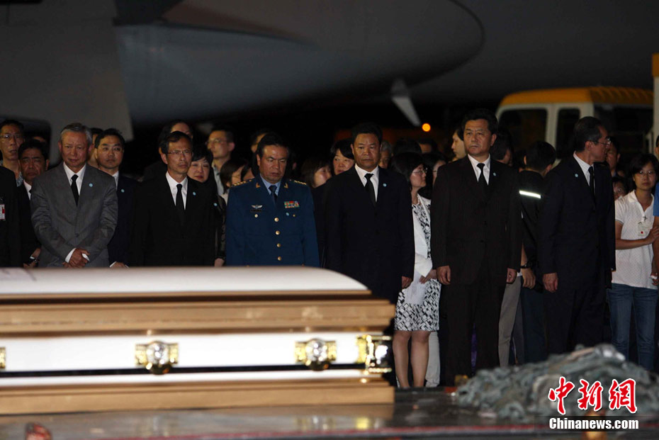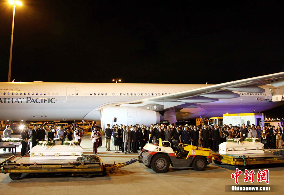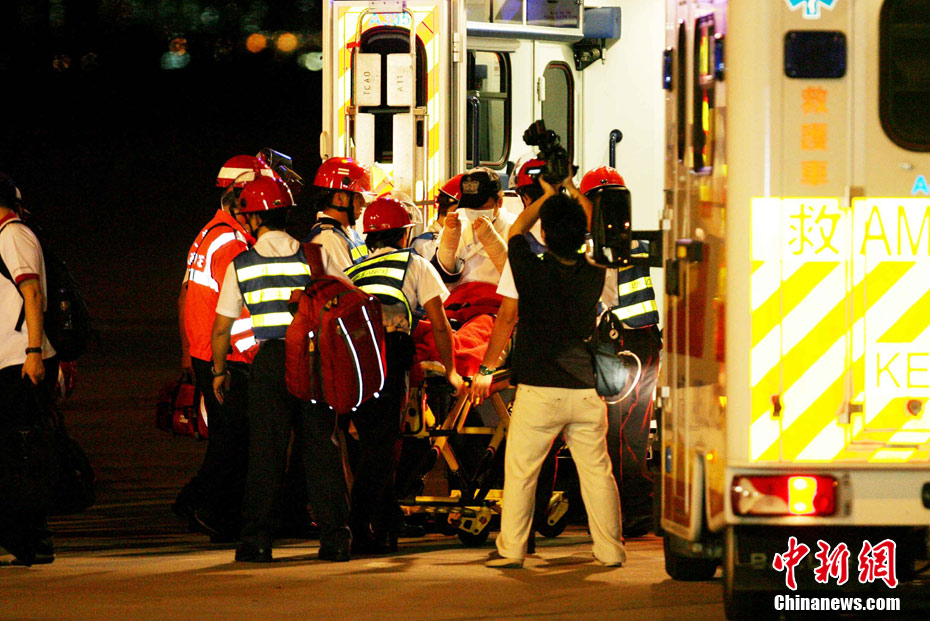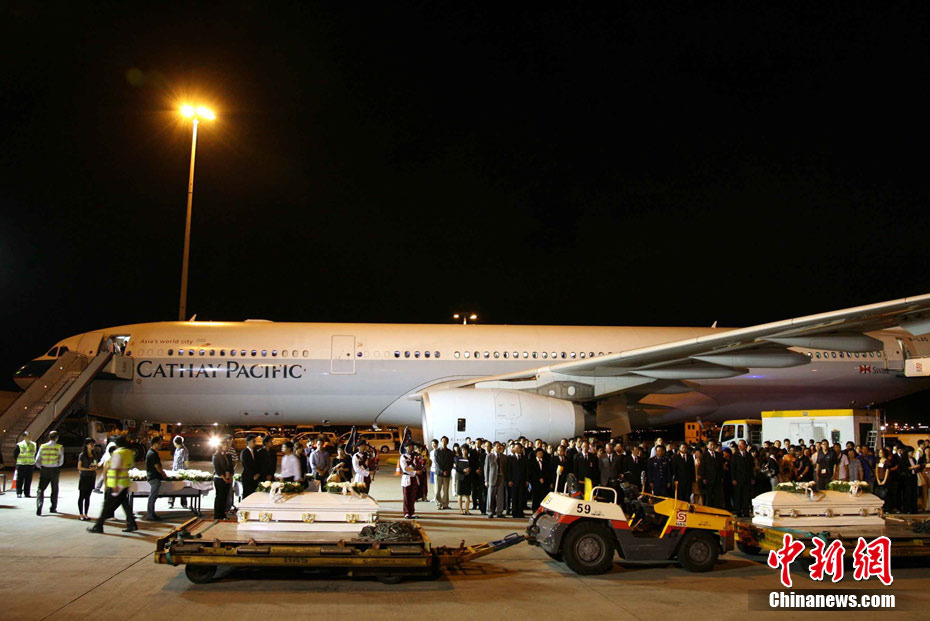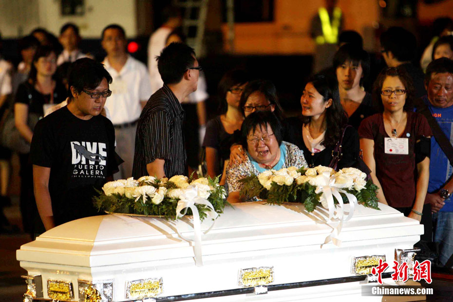 8月25日晚上,在菲律賓挾持人質(zhì)事件中傷亡的傷者和家屬及遇難者遺體乘香港政府包機(jī)返抵香港。特區(qū)政務(wù)司司長(zhǎng)唐英年、中聯(lián)辦副主任李剛、及多名特區(qū)官員上機(jī)慰問(wèn)。停機(jī)坪又舉行了告別儀式,唐英年及家屬在風(fēng)笛聲中,將花圈蓋上靈柩。整個(gè)儀式歷時(shí)一個(gè)多小時(shí),靈柩隨即運(yùn)往葵涌公眾殮房。部份傷者送威爾斯醫(yī)院治理。中新社發(fā) 洪少葵 攝