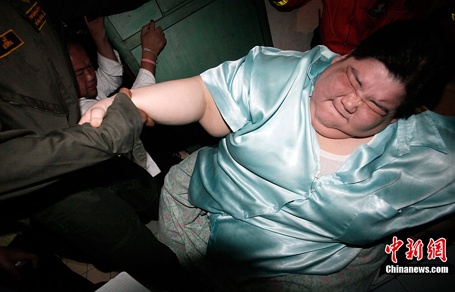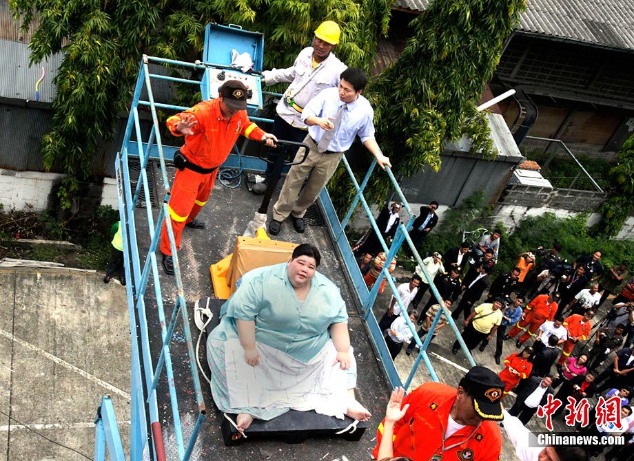 泰國(guó)最胖的女子烏努埃蓬(Umnuayporn Tongprapai)于當(dāng)?shù)貢r(shí)間8月26日在政府派遣的由工程師、拆卸專家、救援隊(duì)、醫(yī)生和護(hù)士組成的救援團(tuán)隊(duì)幫助下“走”出三年未曾離開(kāi)的住所。44歲的烏努埃蓬住在泰國(guó)首都曼谷的郊區(qū),她的體重高達(dá)274公斤,被認(rèn)為是泰國(guó)最胖的人。
