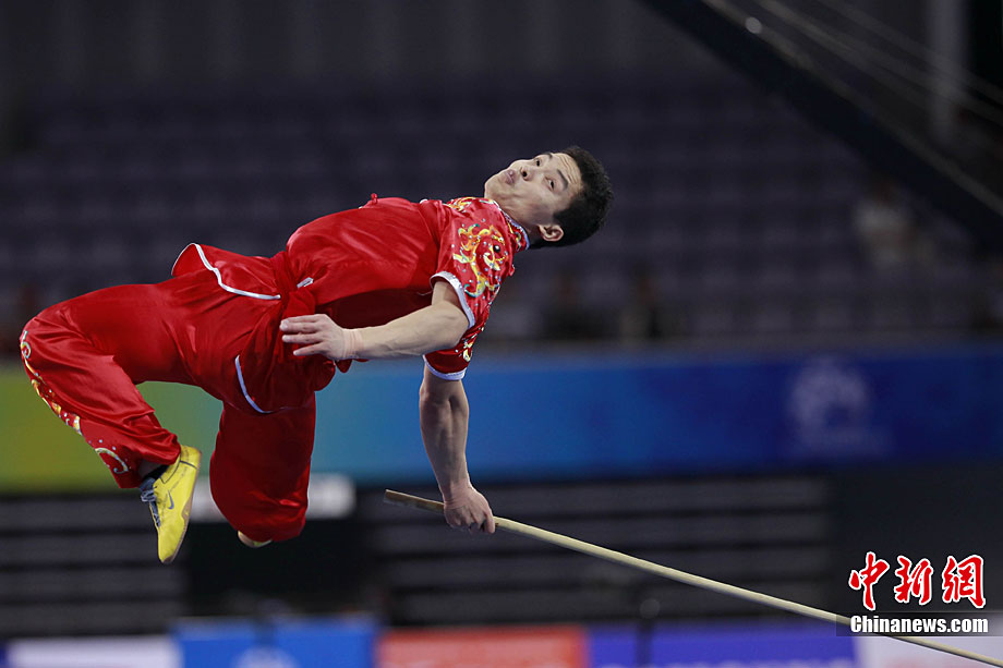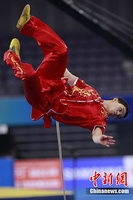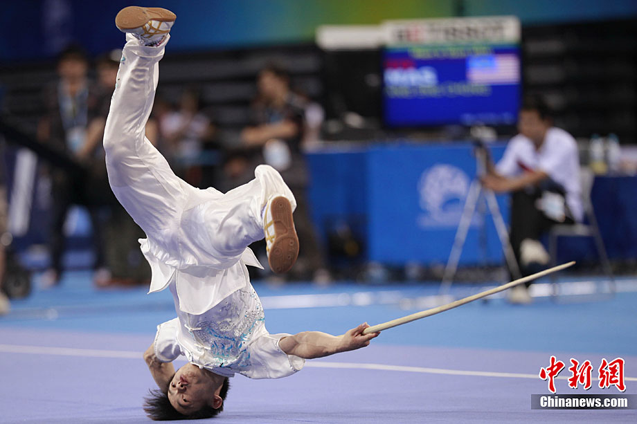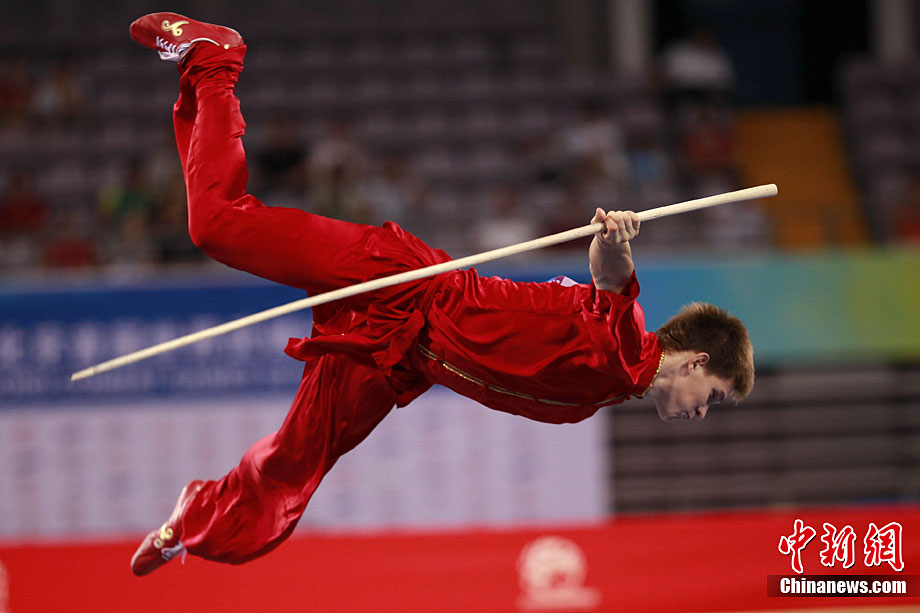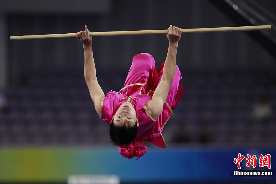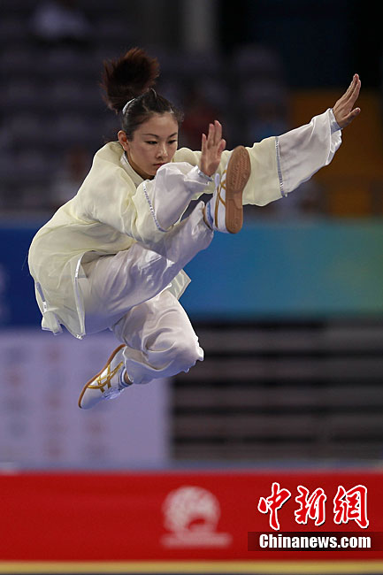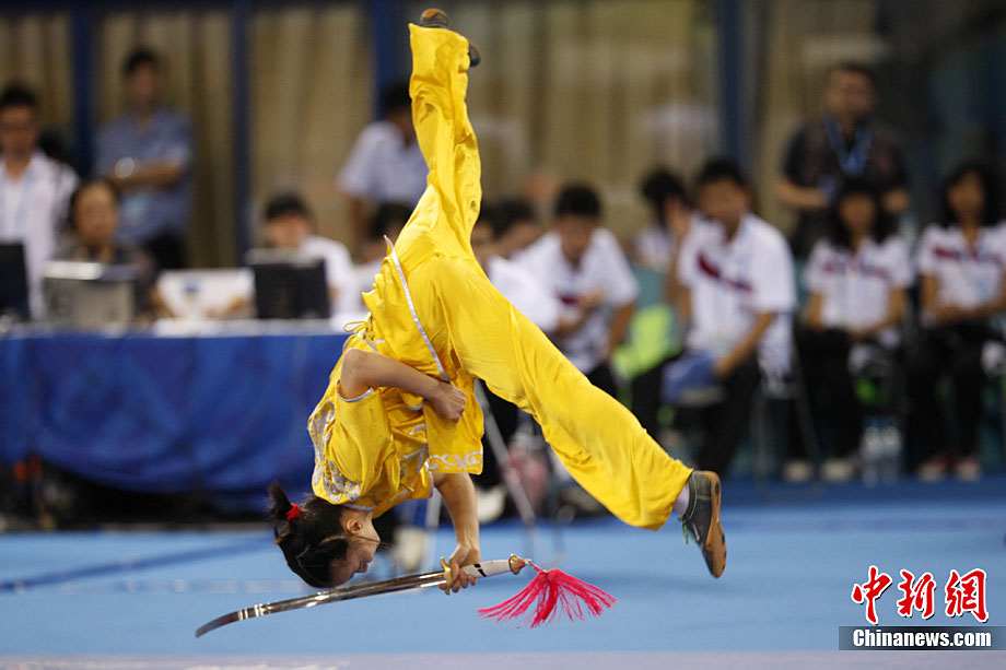 8月28日,2010年北京首屆武會進(jìn)行首日比賽,其中武術(shù)項(xiàng)目的比賽在北京奧林匹克體育中心體育館進(jìn)行。圖為中國香港選手Zheng Tian Hui在女子劍術(shù)的比賽中以9.80分穩(wěn)居第一位。中新社記者 盛佳鵬 攝
