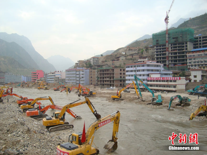 8月30日,舟曲白龍江堰塞湖應(yīng)急排險(xiǎn)和河道應(yīng)急疏通任務(wù),比預(yù)定時(shí)間提前12小時(shí)全面完成。這是解放軍副總參謀長(zhǎng)章沁生30日15時(shí)在舟曲白龍江城江橋頭召開的新聞發(fā)布會(huì)上,向社會(huì)公布的。章沁生在發(fā)布會(huì)上說,到30日12時(shí),城江橋至城關(guān)橋段水位已回落至省道313線最低點(diǎn),城區(qū)積水全部回流歸槽,標(biāo)志著舟曲白龍江堰塞湖應(yīng)急排險(xiǎn)和河道應(yīng)急疏通任務(wù)全面完成。舟曲特大山洪泥石流災(zāi)害發(fā)生后,導(dǎo)致白龍江形成堰塞湖致使江水水位暴漲,舟曲縣城三分之一街區(qū)被淹。武警水電部隊(duì)、蘭州軍區(qū)工程兵某部每天出動(dòng)上千官兵,大型機(jī)械百余臺(tái),先是排除了堰塞湖潰決險(xiǎn)情,從13日轉(zhuǎn)入河道應(yīng)急疏通任務(wù),24小時(shí)持續(xù)奮戰(zhàn),終于提前完成了這一艱巨任務(wù)。圖為在舟曲縣城江橋上游河段,解放軍和武警部隊(duì)晝夜不停對(duì)河道進(jìn)行除險(xiǎn)清淤。 中新社發(fā) 郭海勇 攝